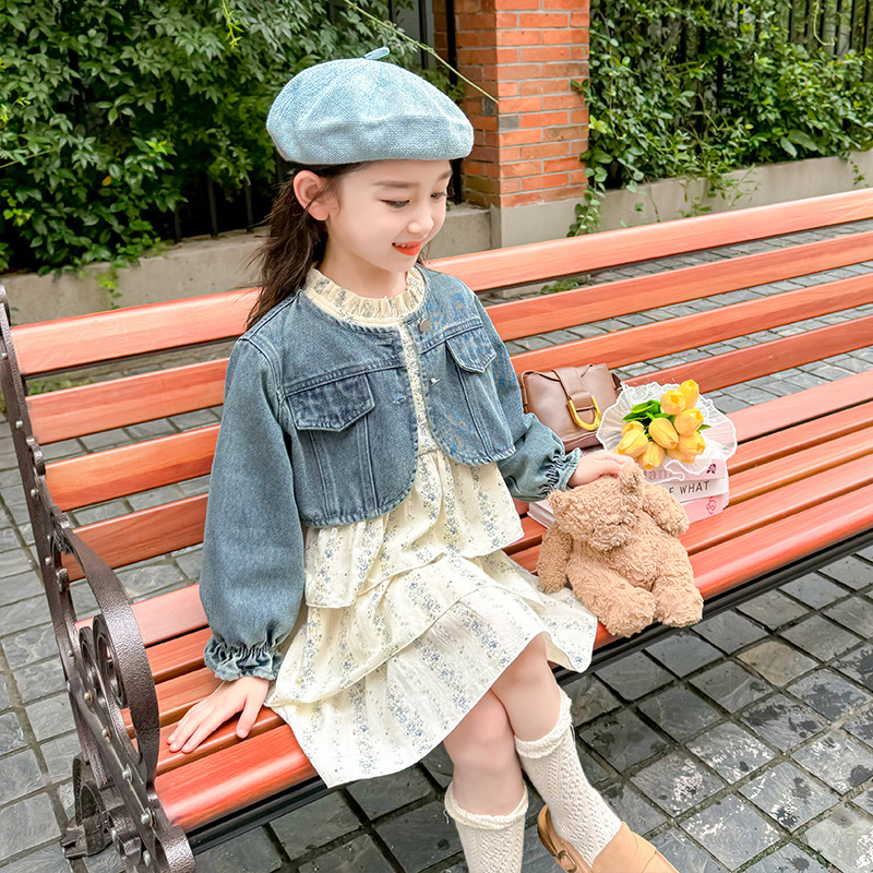 소녀 세트 2024 새로운 패션 어린 소녀 꽃 원피스 데님 세트 어린이 투피스 세트