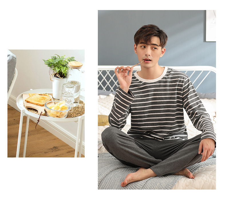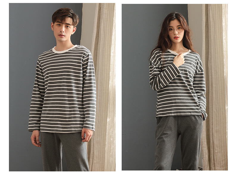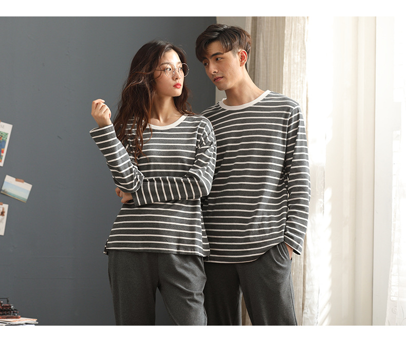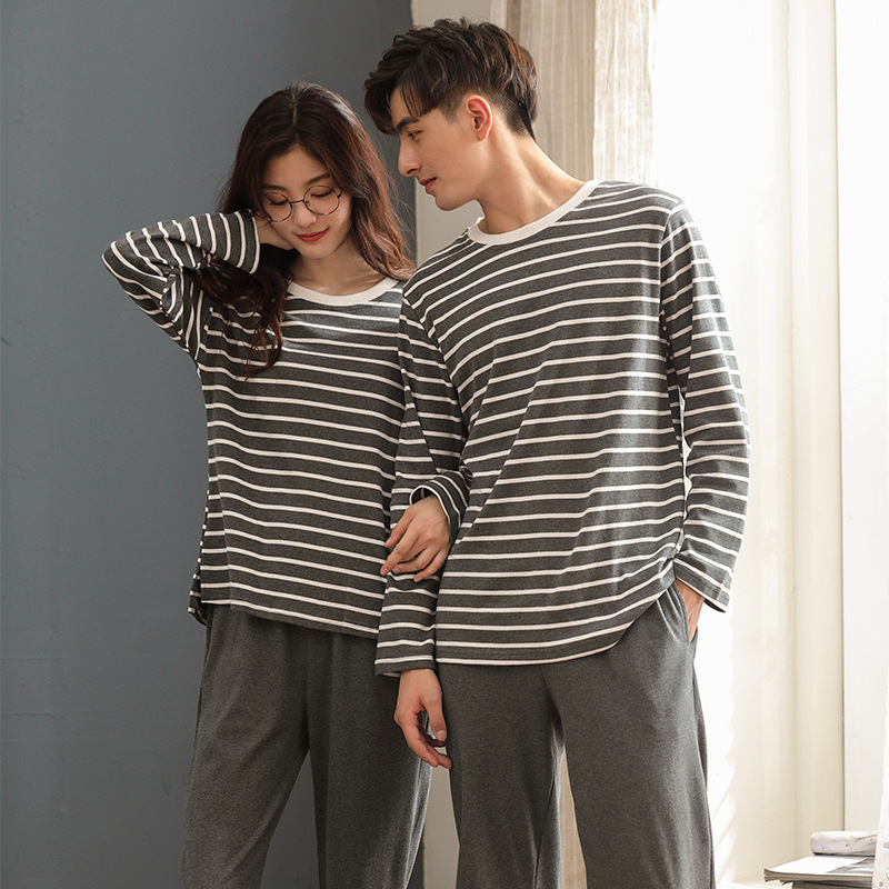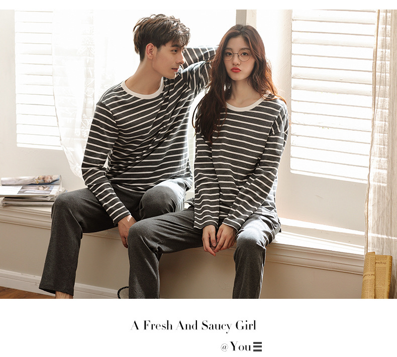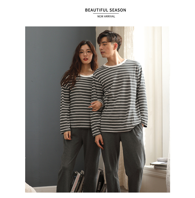 커플 잠옷 여성의 봄과 가을 타이트한 면 긴 소매 봄과 가을 플러스 사이즈 둥근 목 느슨한 집 옷 세트 줄무늬