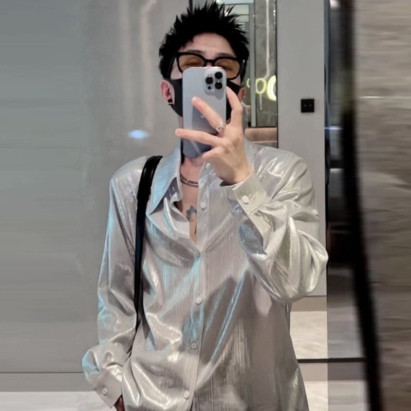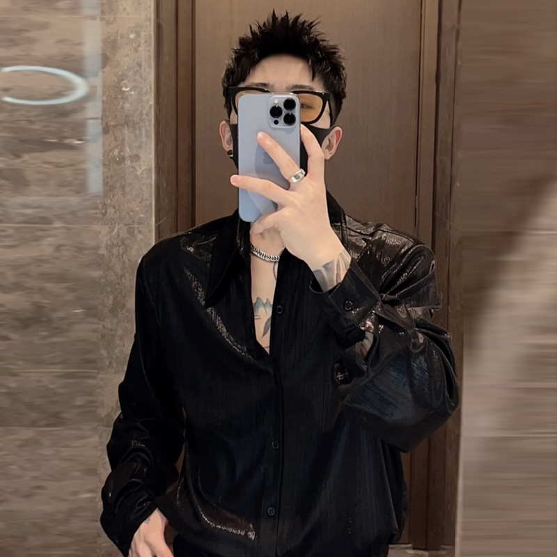 트렌디 한 브랜드 패션 간단한 비 다림질 셔츠 봄 가을 플루톤 잘 생긴 셔츠 남성용 틈새 단색 밝은 고급 액체 유약스토어 가기