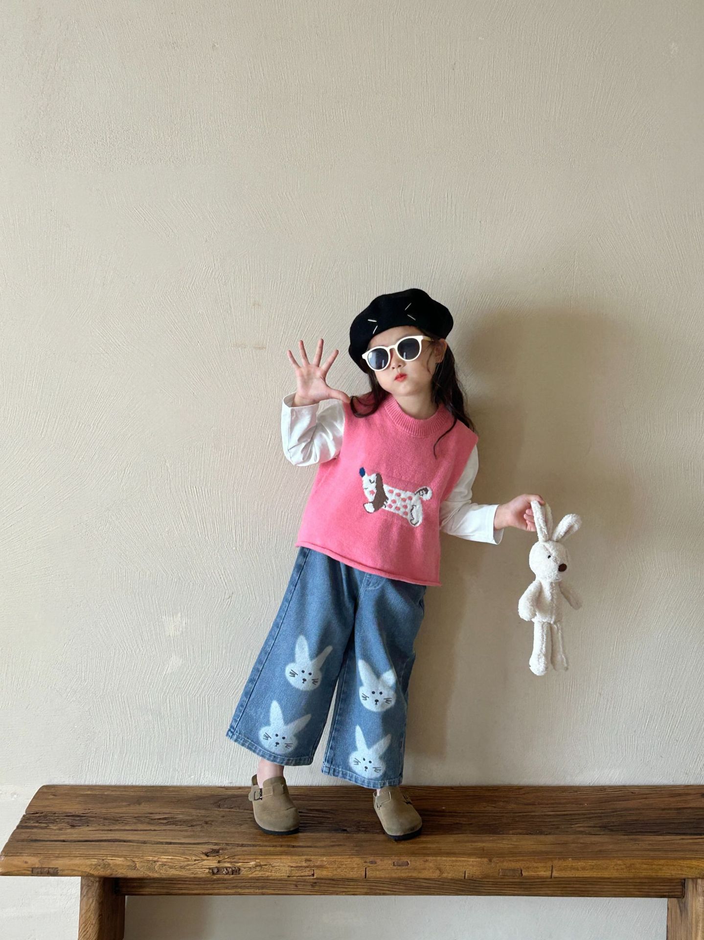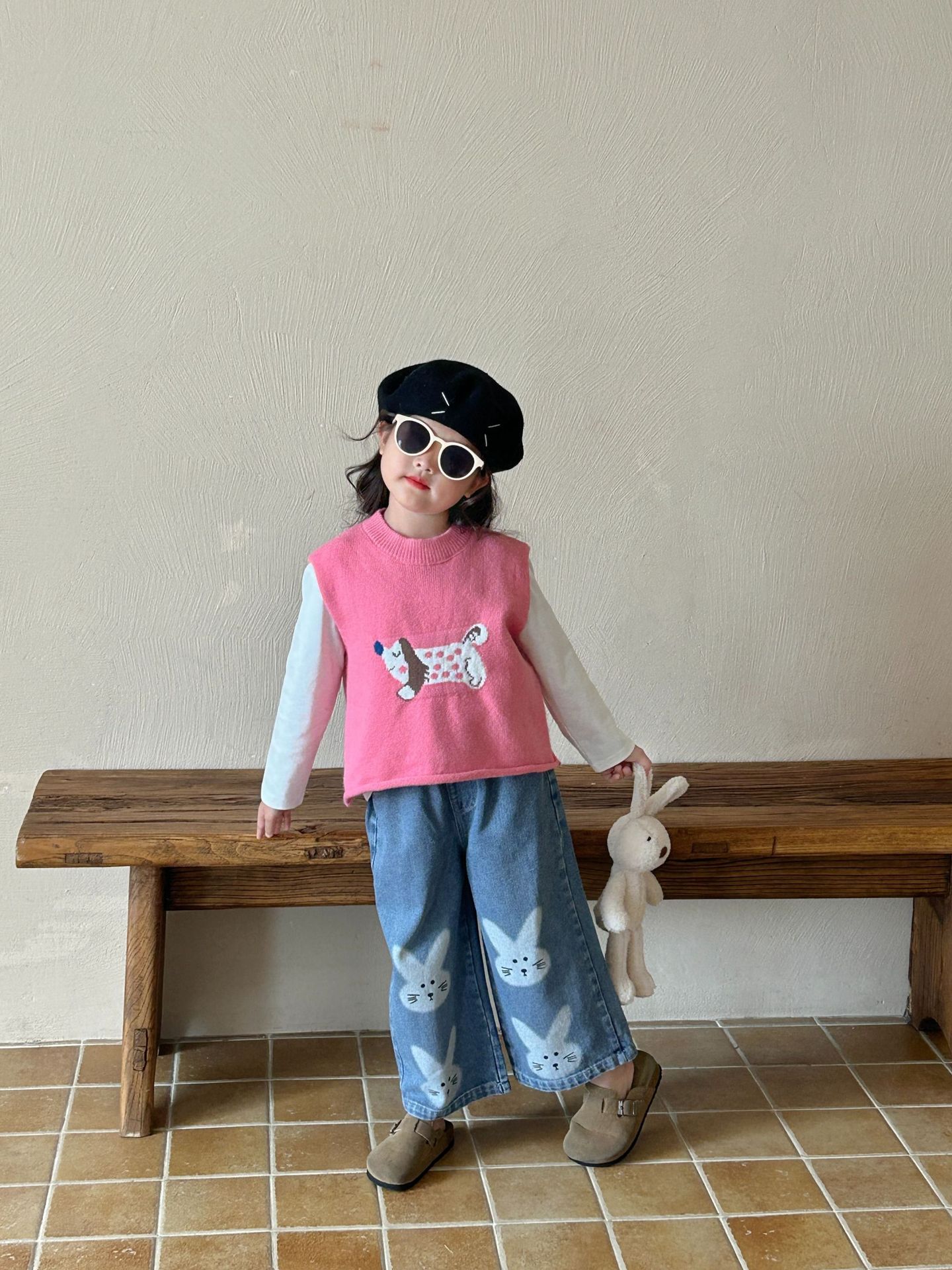 반품이나 교환 불가, 원래 가격 90, 여아 조끼 가을 의류 세트, 세련된 어린이 만화 스웨터 조끼, 여아 가을 양복 조끼스토어 가기