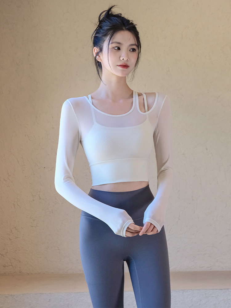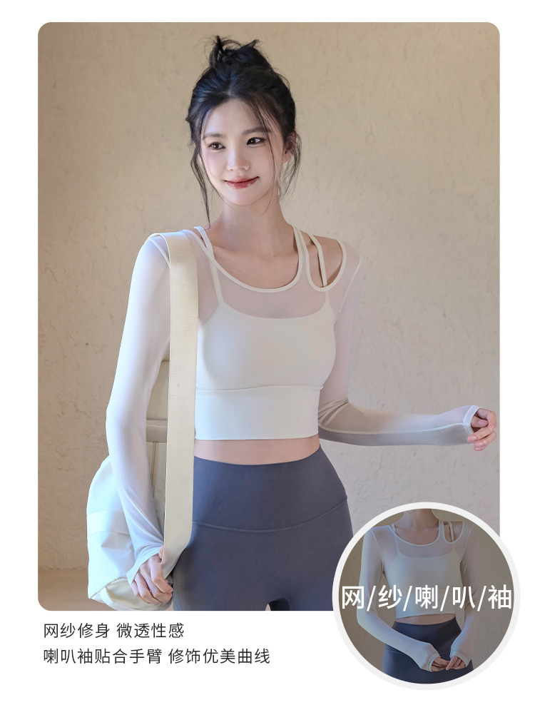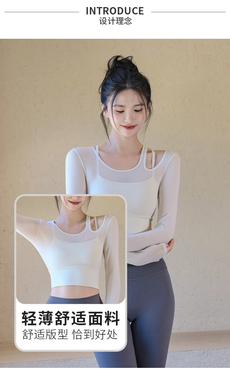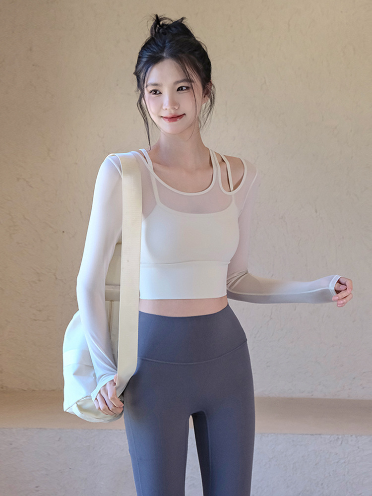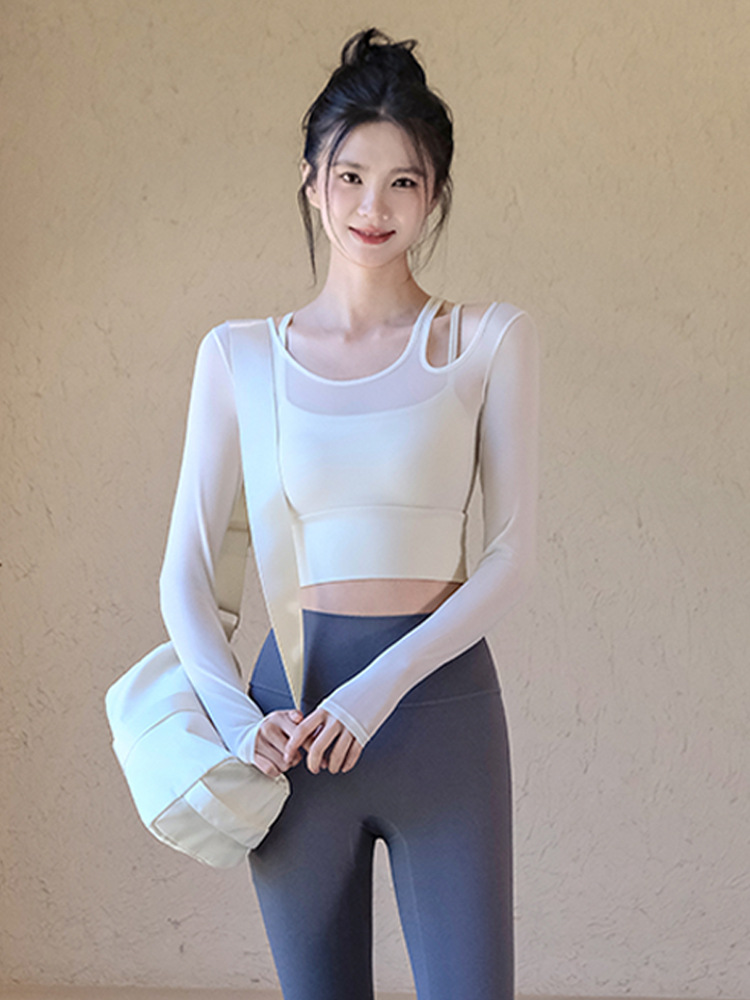 요가 의류 여성의 가을과 겨울 메쉬 가짜 투피스 스포츠 탑 아름다운 스트랩 가슴 패드 긴 소매 필라테 훈련 피트니스 의류