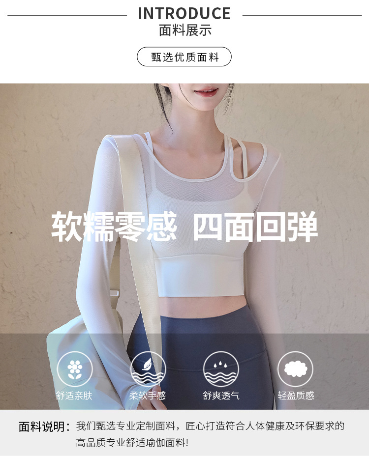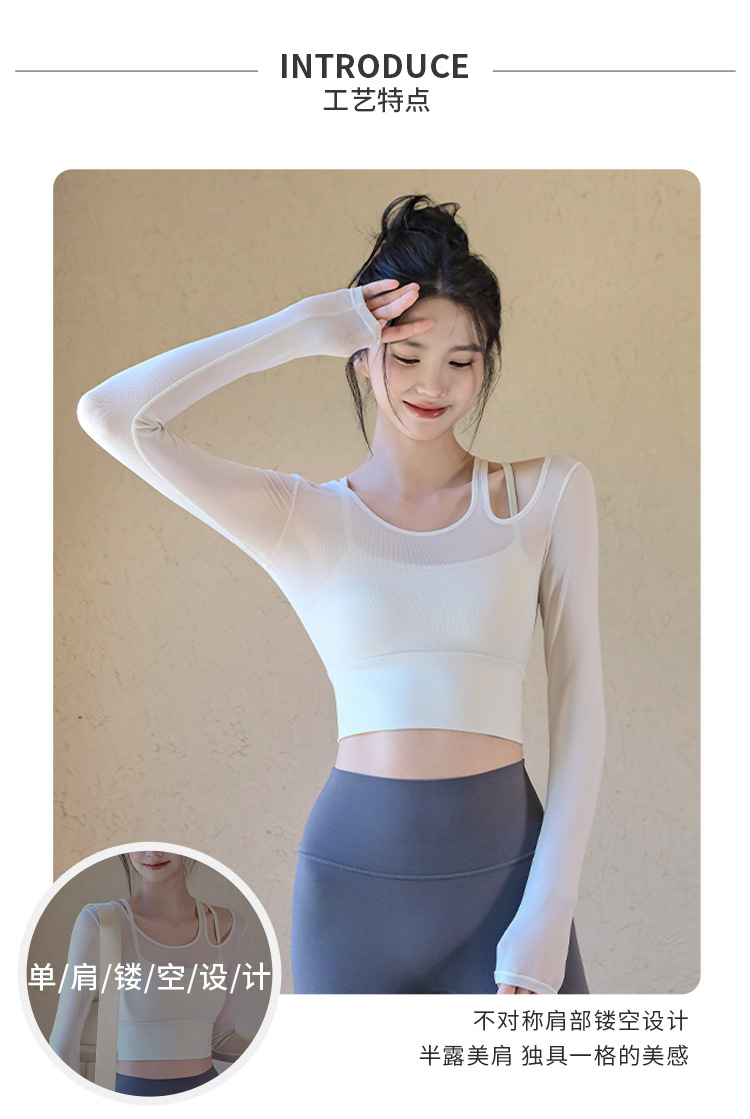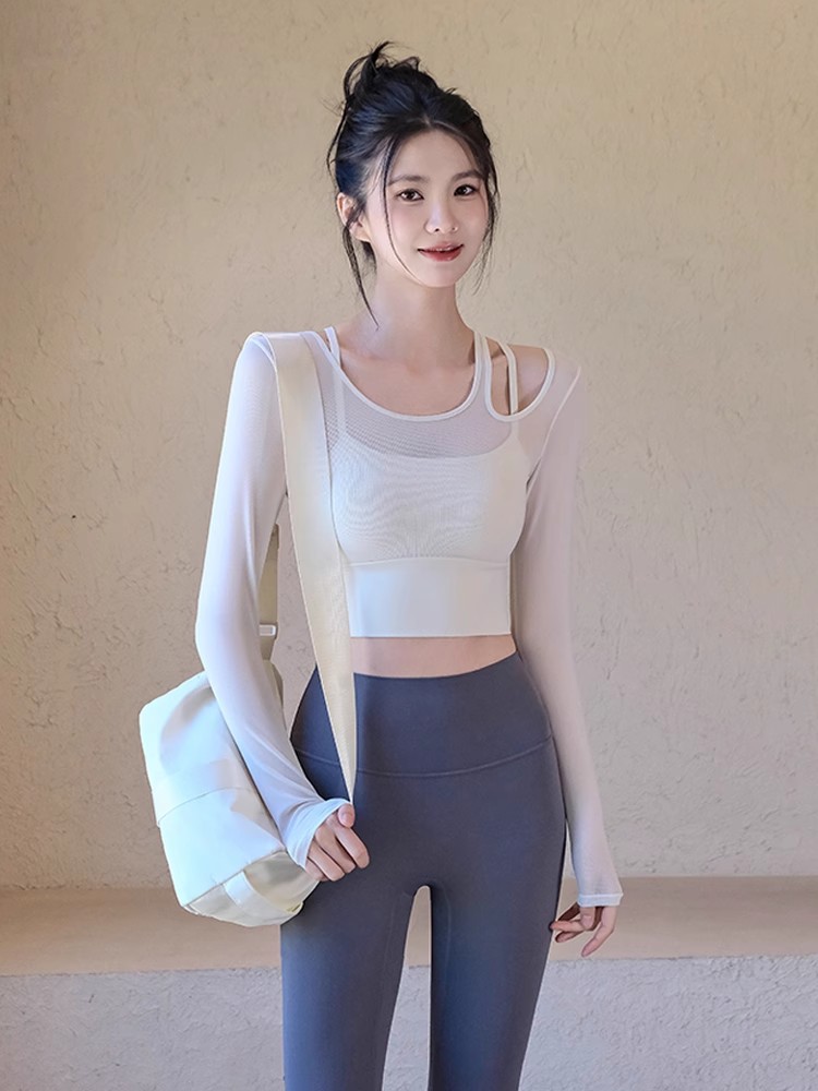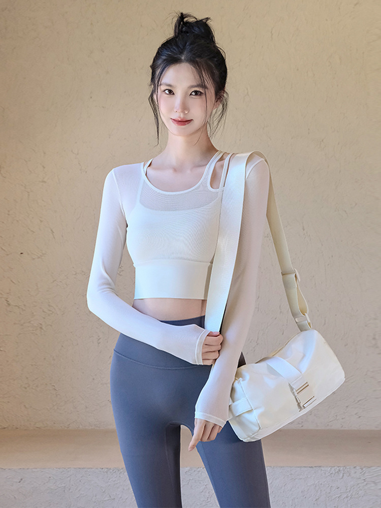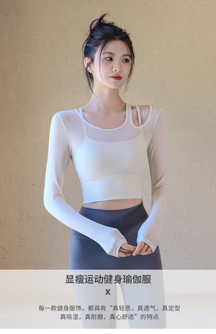 요가 의류 여성의 가을과 겨울 메쉬 가짜 투피스 스포츠 탑 아름다운 스트랩 가슴 패드 긴 소매 필라테 훈련 피트니스 의류