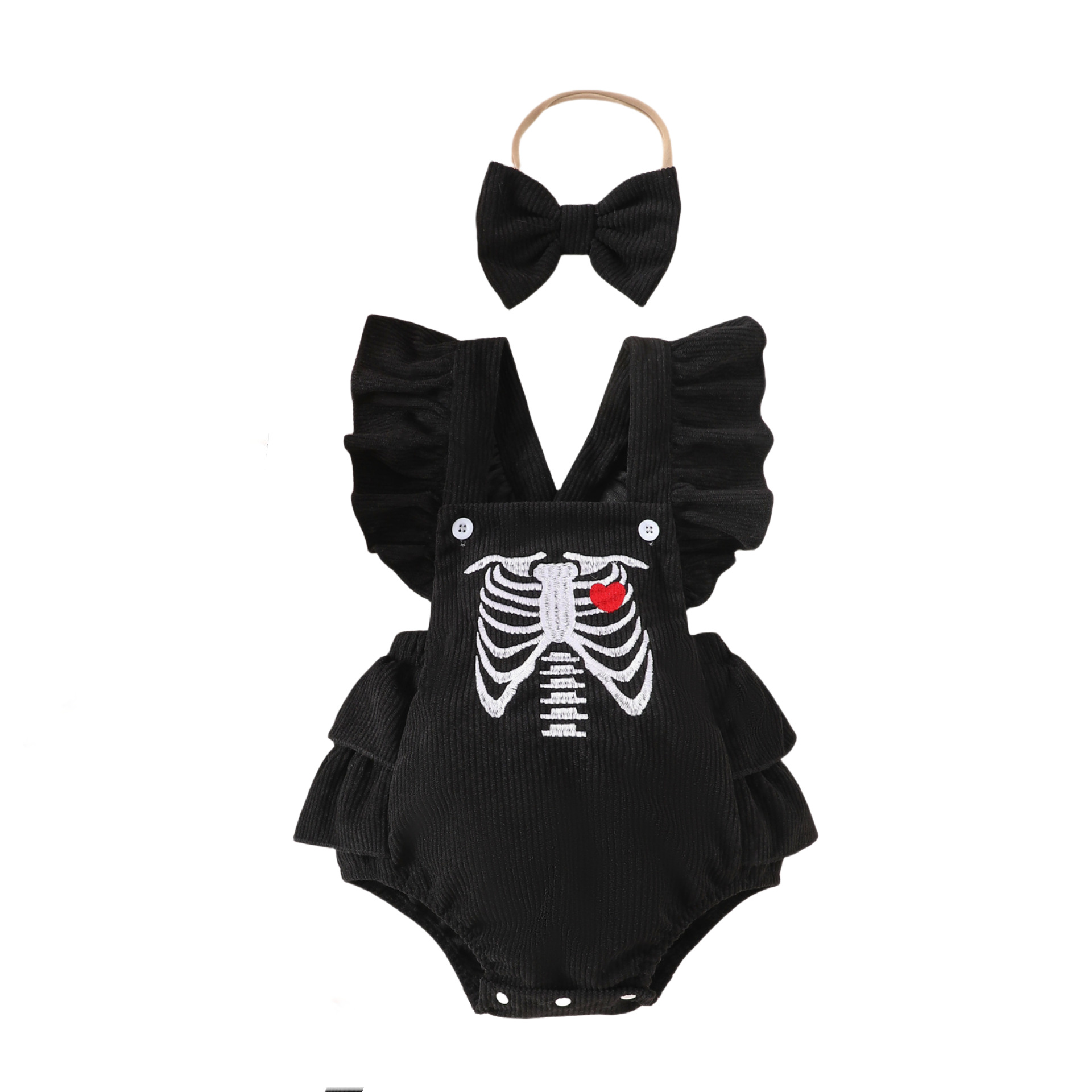 할로윈 어린이 의류 2024 여름 새로운 유럽과 미국 여성 아기 유령 두개골 자수 스트랩 올인원 헤어 밴드