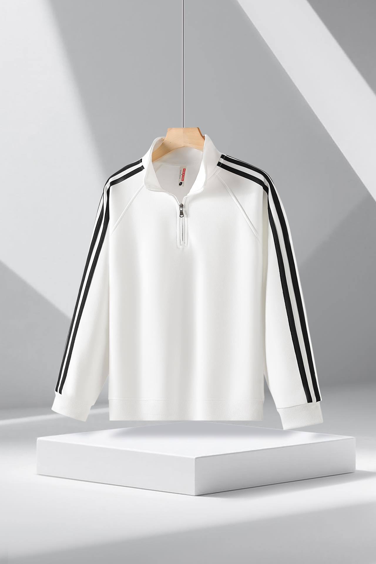 • 삼선 반지퍼 스탠드 칼라 기모 맨투맨 티셔츠 (화이트)