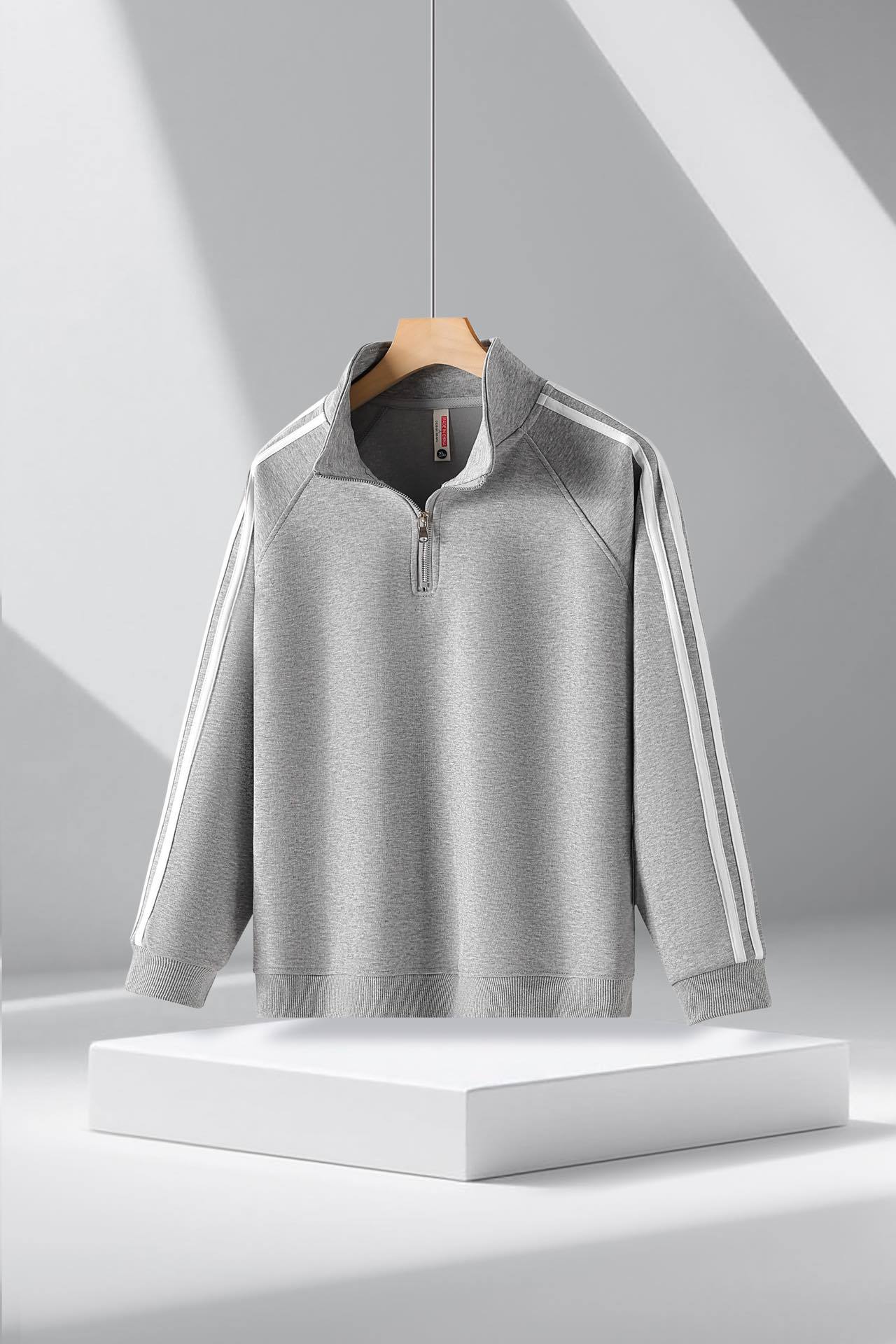 • 세 줄 스트라이프 하프 집업 기모 맨투맨 티셔츠 (회색)