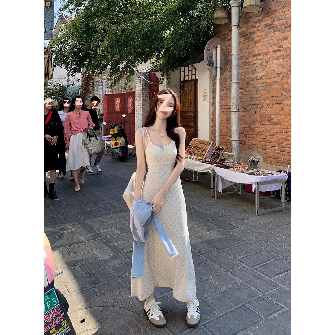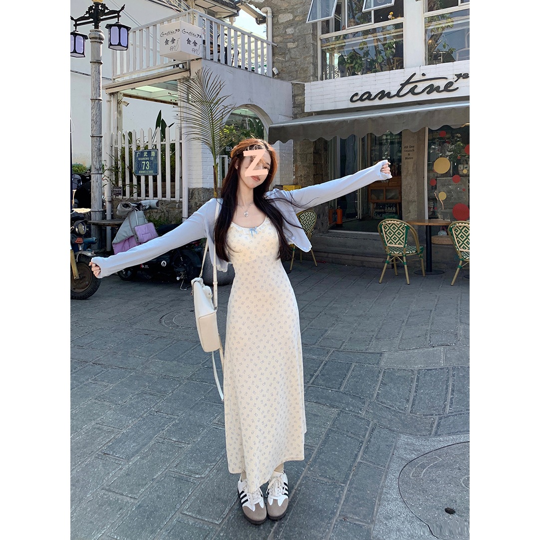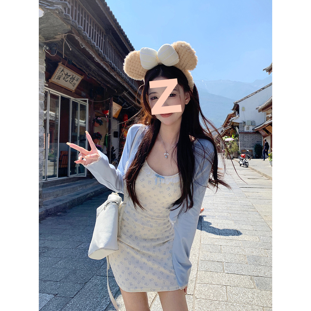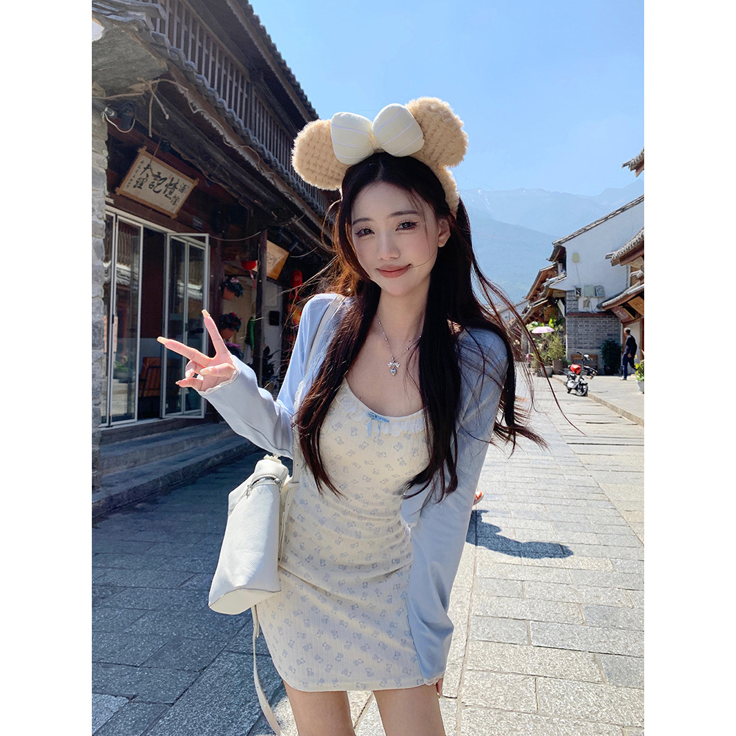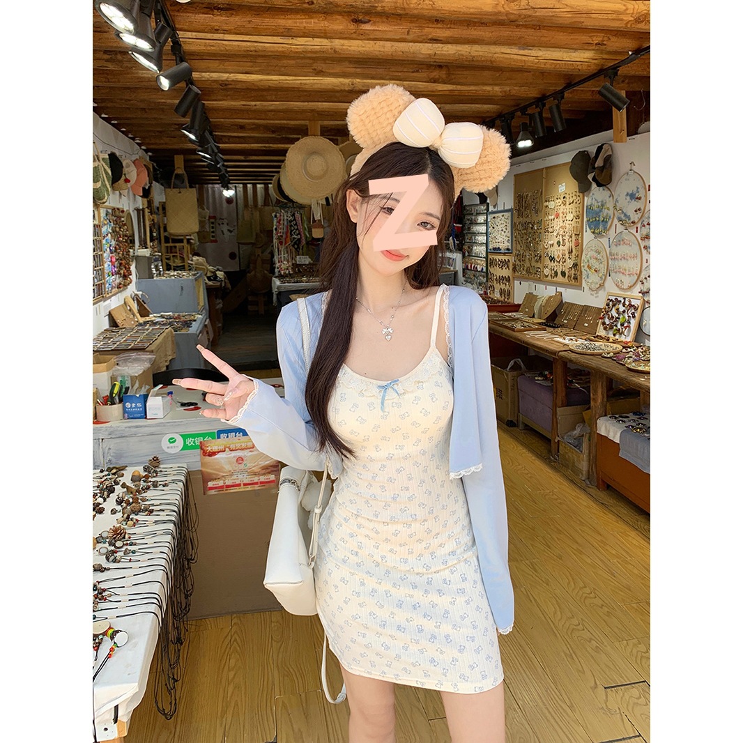2024 패션 세트 여성 레이스 카디건 재킷 여름 새 곰 인쇄 슬링 원피스 투피스 세트스토어 가기