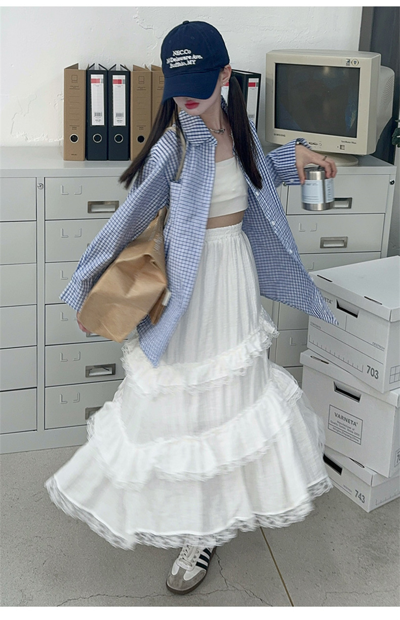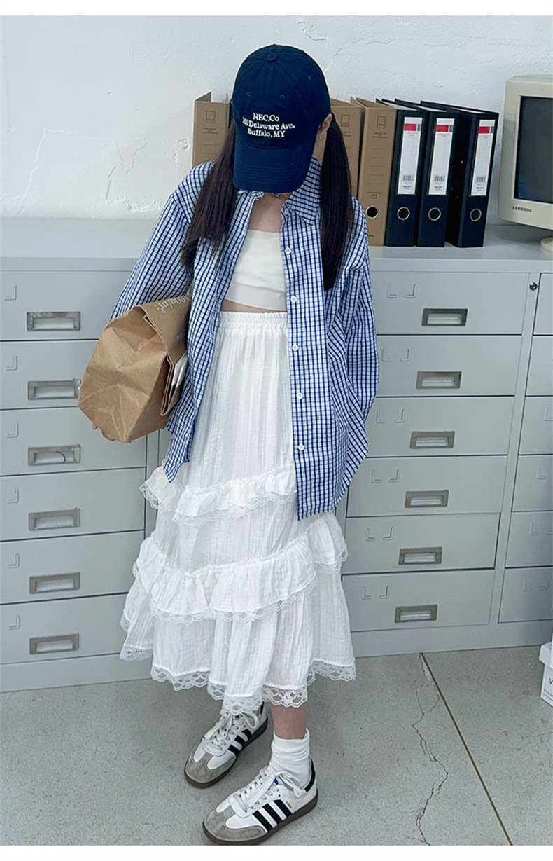 여자 가을 셔츠 2024 패션 소녀 한국 스타일 세련된 블루 격자 무늬 셔츠 케이크