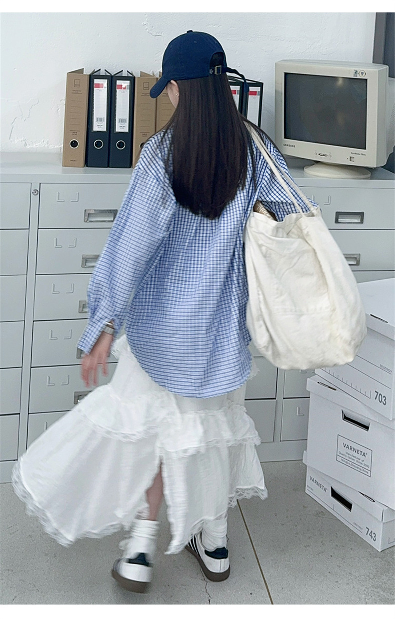 여자 가을 셔츠 2024 패션 소녀 한국 스타일 세련된 블루 격자 무늬 셔츠 케이크스토어 가기