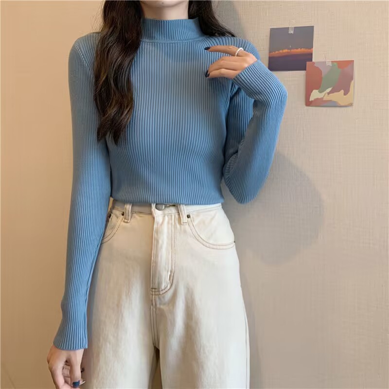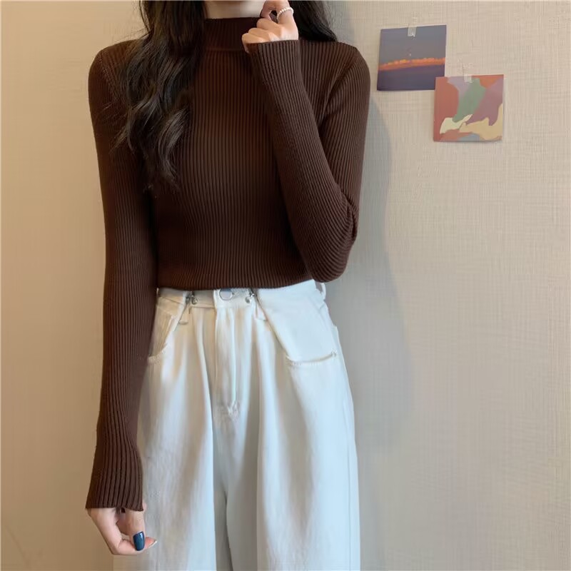 도매 단색 세미 하이 칼라 바닥 셔츠 여성의 2024 가을과 겨울 다재다능한 학생 슬림 하이 칼라 스웨터 여성