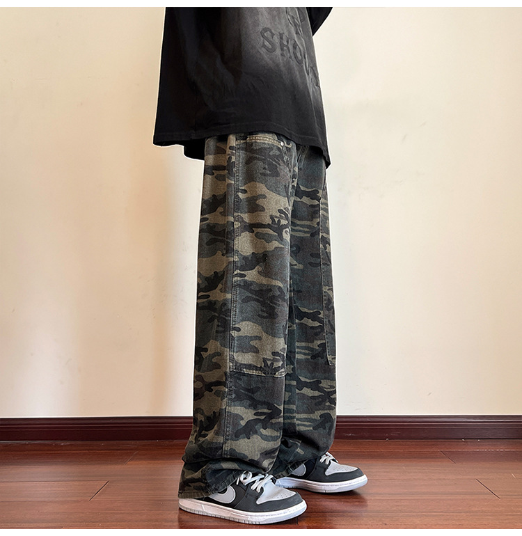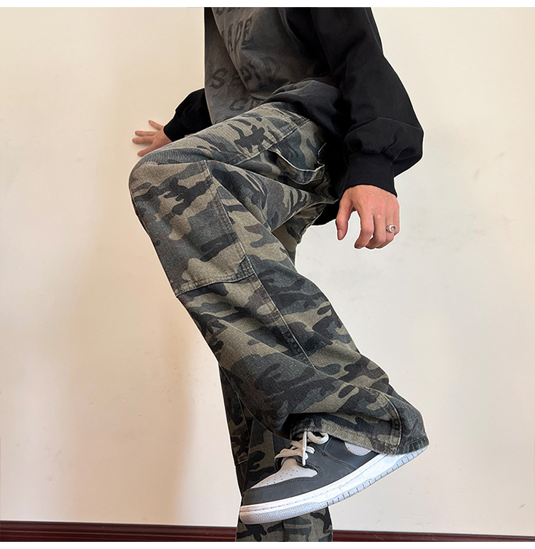 미국식 하이 스트리트 카키 위장 툴링 청바지 여성용 스트레이트 루즈 레트로 힙합 스타일 하이 허리 양조 와이드 레그 팬츠스토어 가기