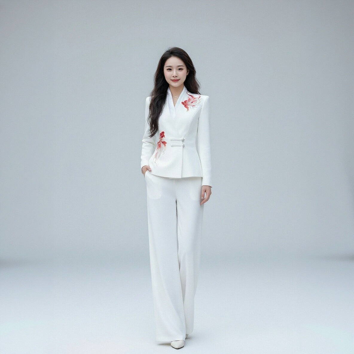 • 흰색 잉어 자수 정장 세트