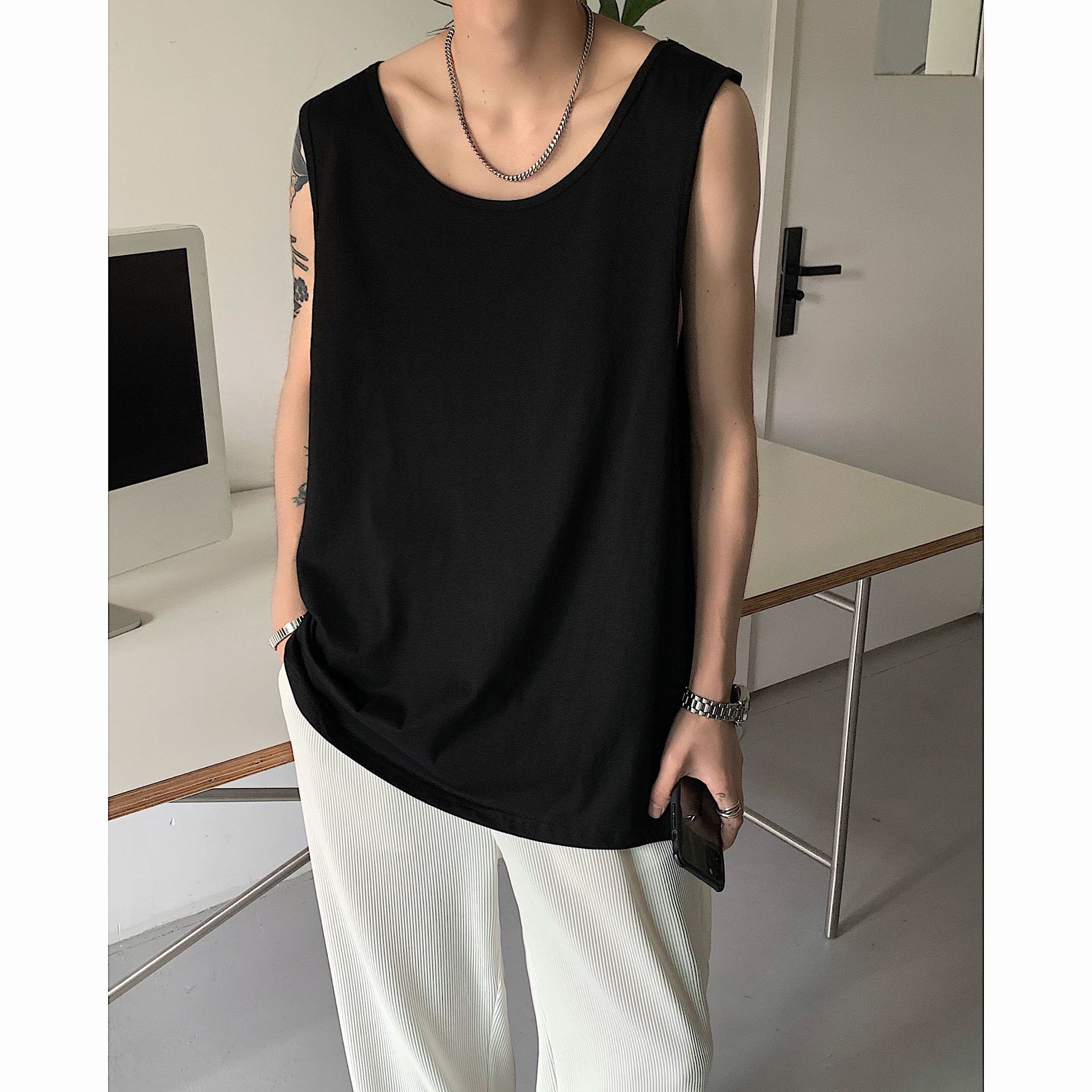 화이트 빅 넥 민소매 티셔츠 남성용 여름 웨이스트 밴드 이너 트렌디 아메리칸 헤비 조끼 남자 로우 칼라 베이스 셔츠스토어 가기