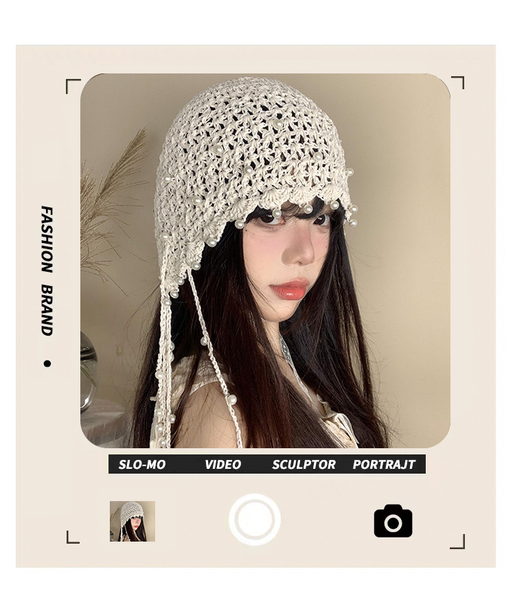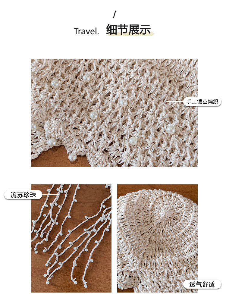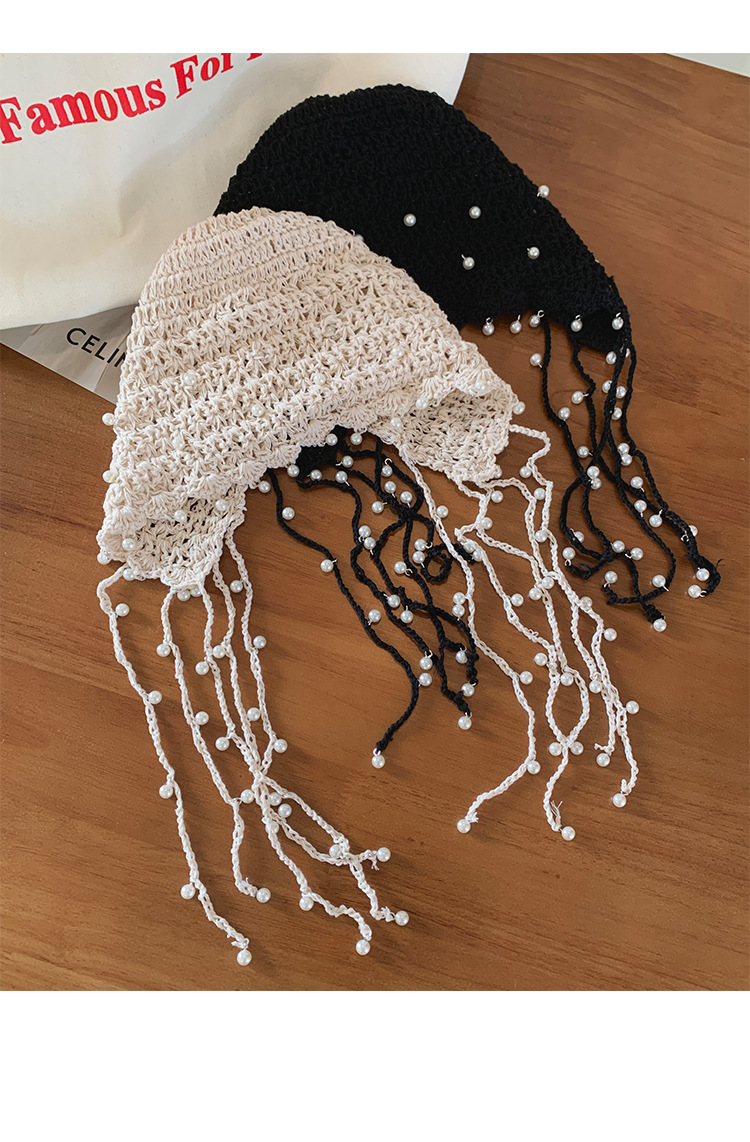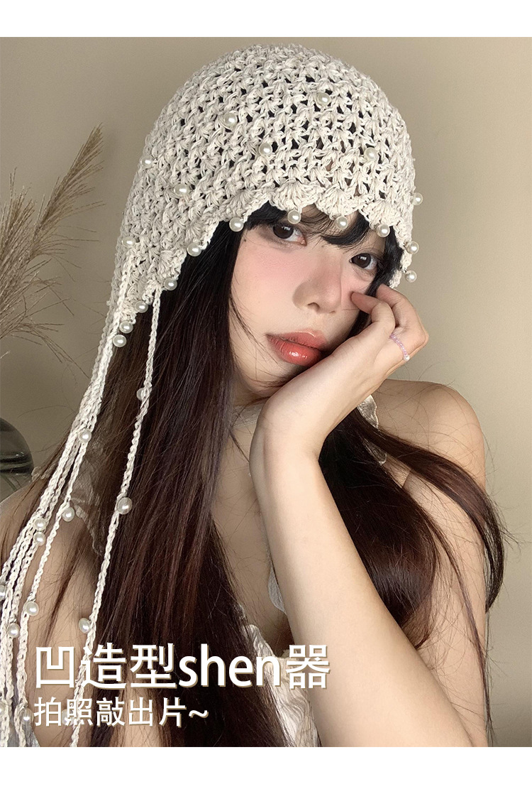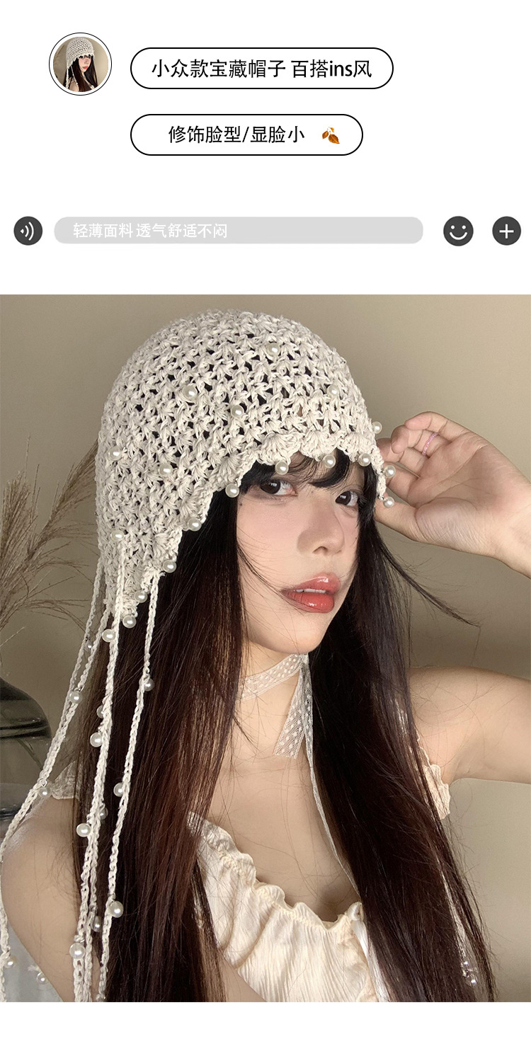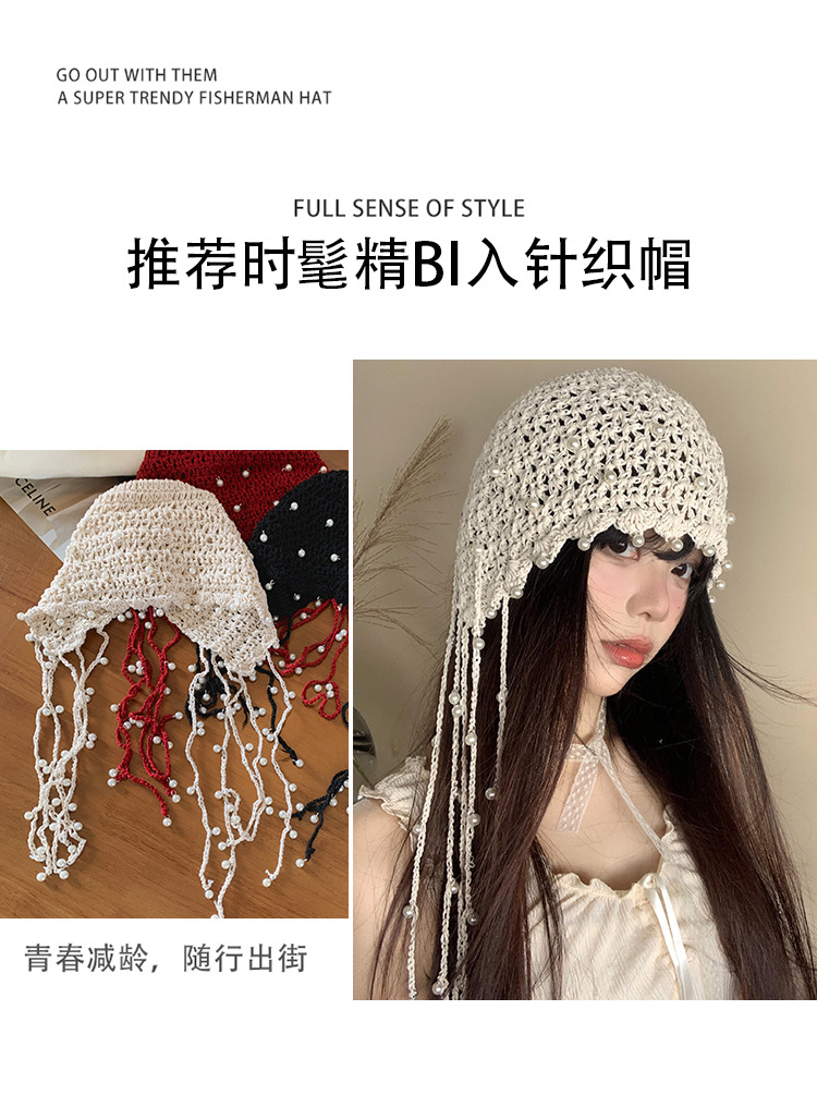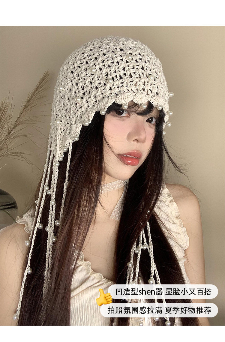 중공 진주 술 펜던트 발가락 모자 여성 여름 유명한 민족 스타일 니트 풀오버 캡 복고풍 얼굴 표시 작은 모자
