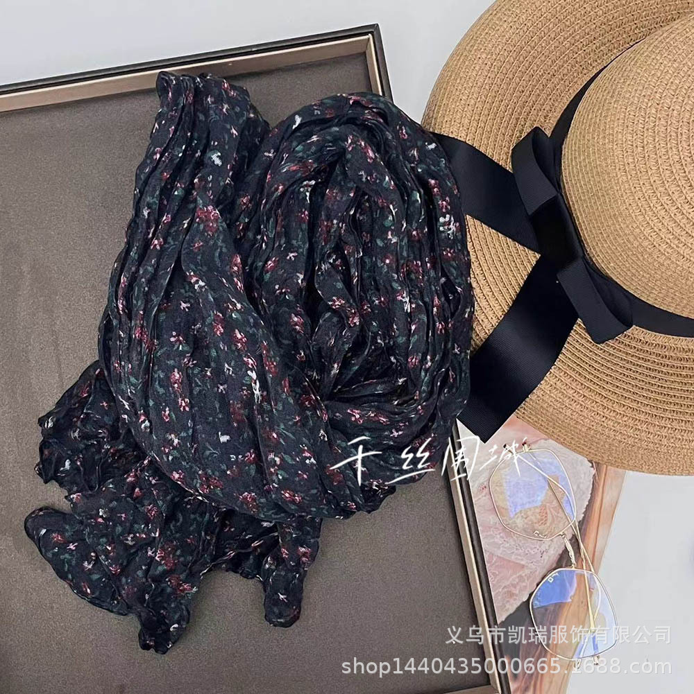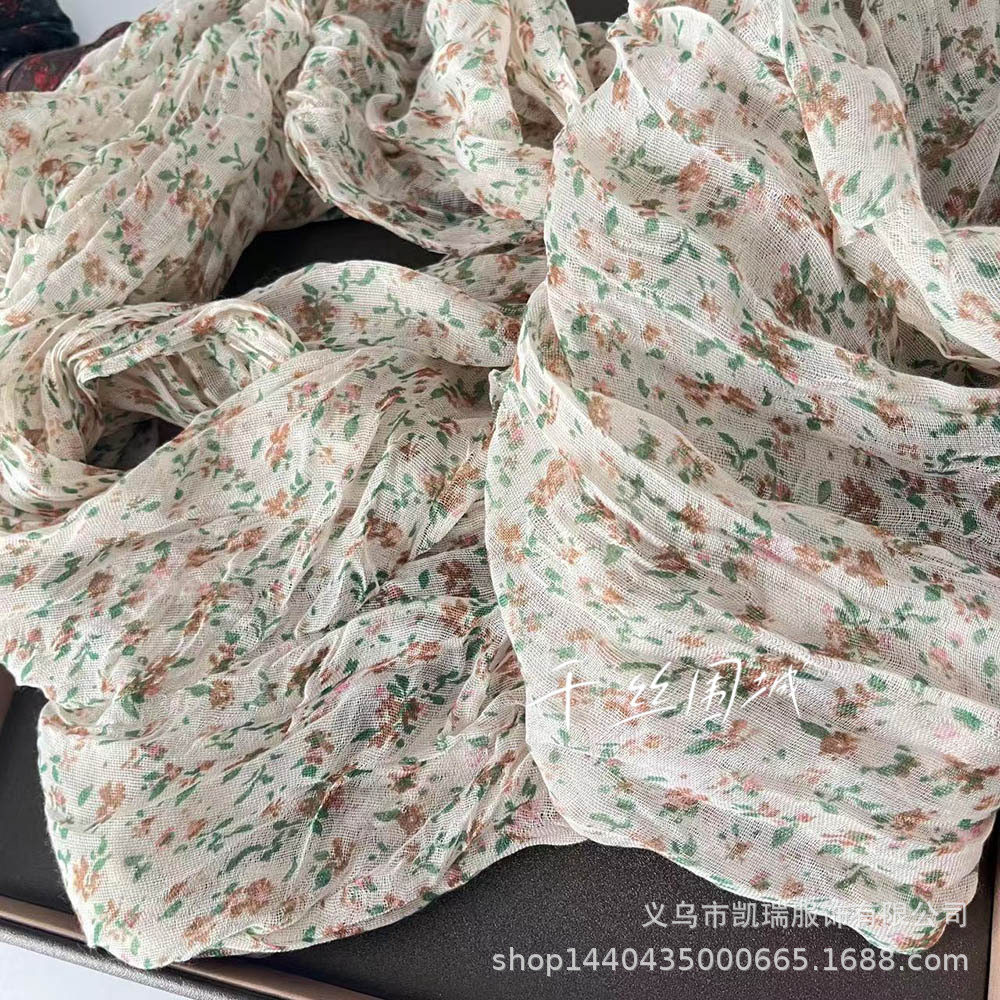 2024 꽃면과 리넨 스카프 새로운 한국 스타일 선 스크린 스카프 주름 얇은 빈티지 꽃 인쇄 목도리