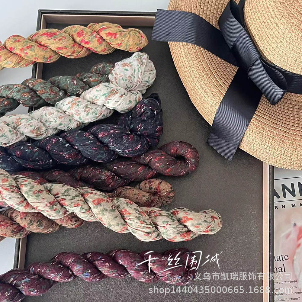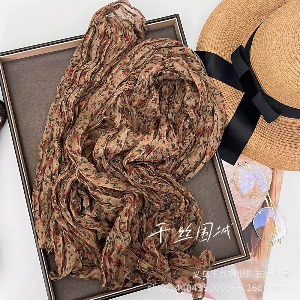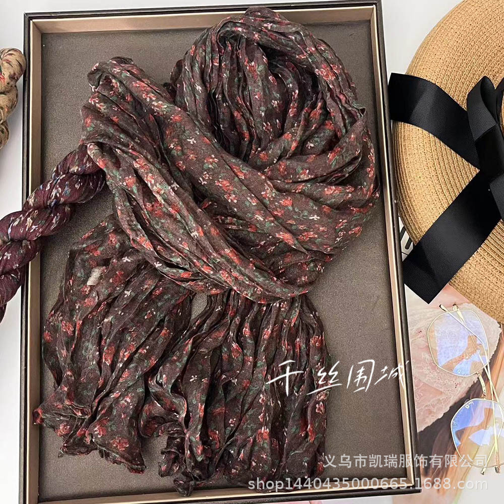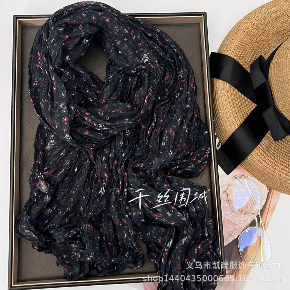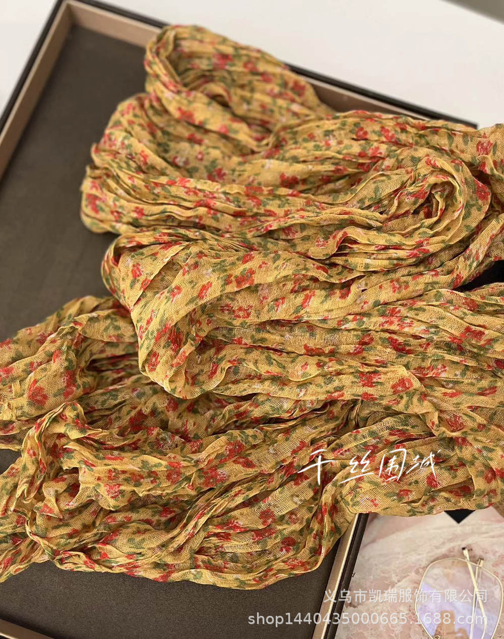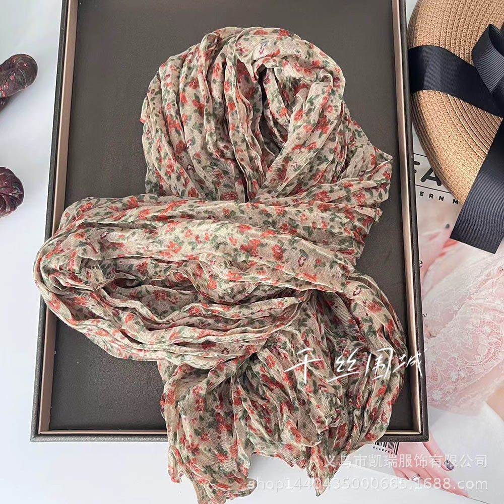 2024 꽃면과 리넨 스카프 새로운 한국 스타일 선 스크린 스카프 주름 얇은 빈티지 꽃 인쇄 목도리스토어 가기