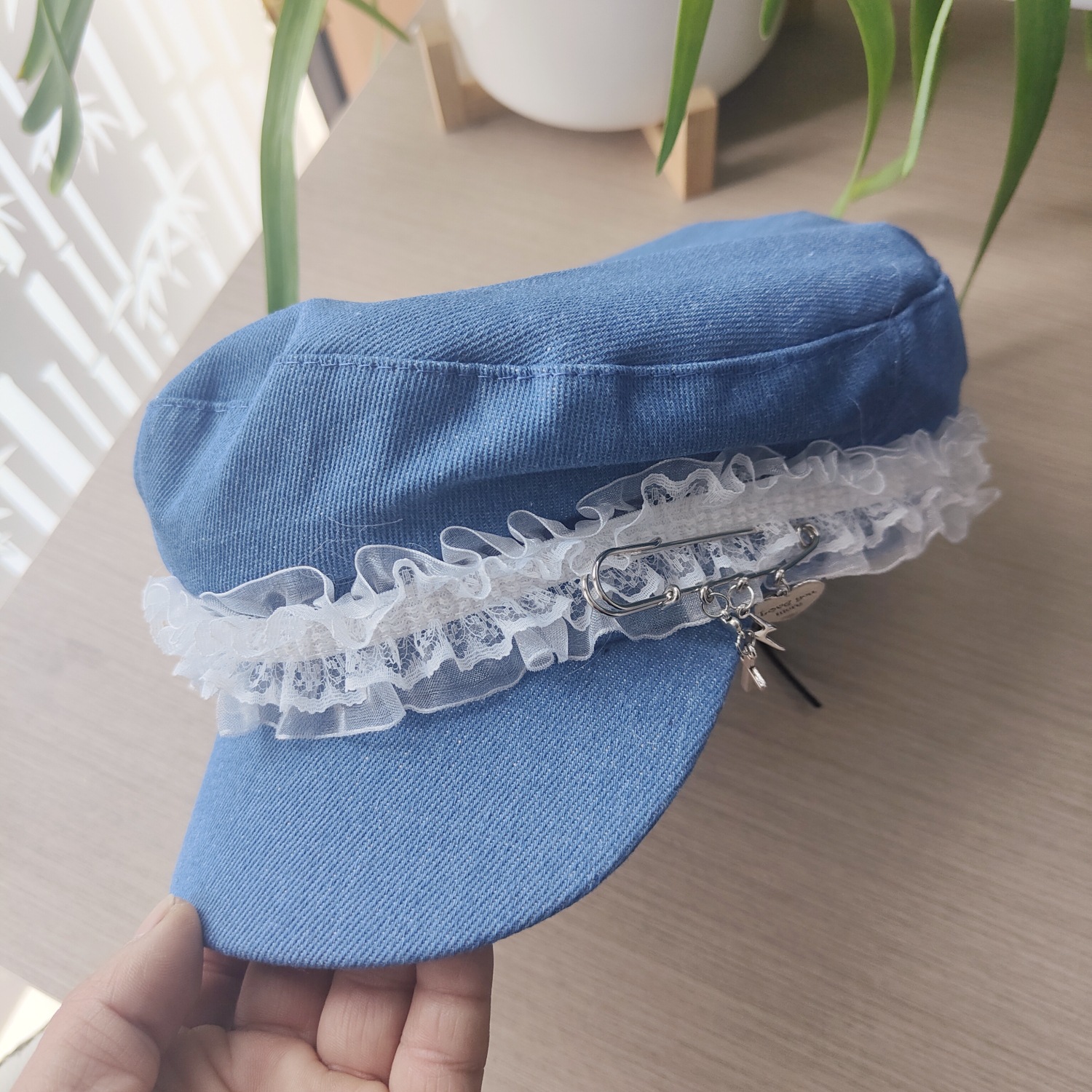 Ins 사이버 연예인 레이스 핀 달콤한 데님 군사 모자 틈새 달콤한 얼굴 작은 거리 팔각형 모자 페인터 모자 여성용