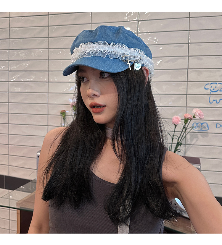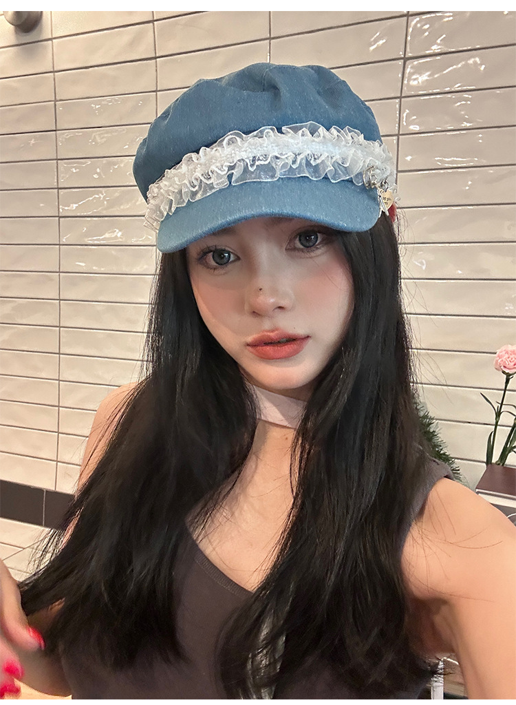 Ins 사이버 연예인 레이스 핀 달콤한 데님 군사 모자 틈새 달콤한 얼굴 작은 거리 팔각형 모자 페인터 모자 여성용스토어 가기
