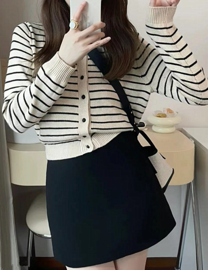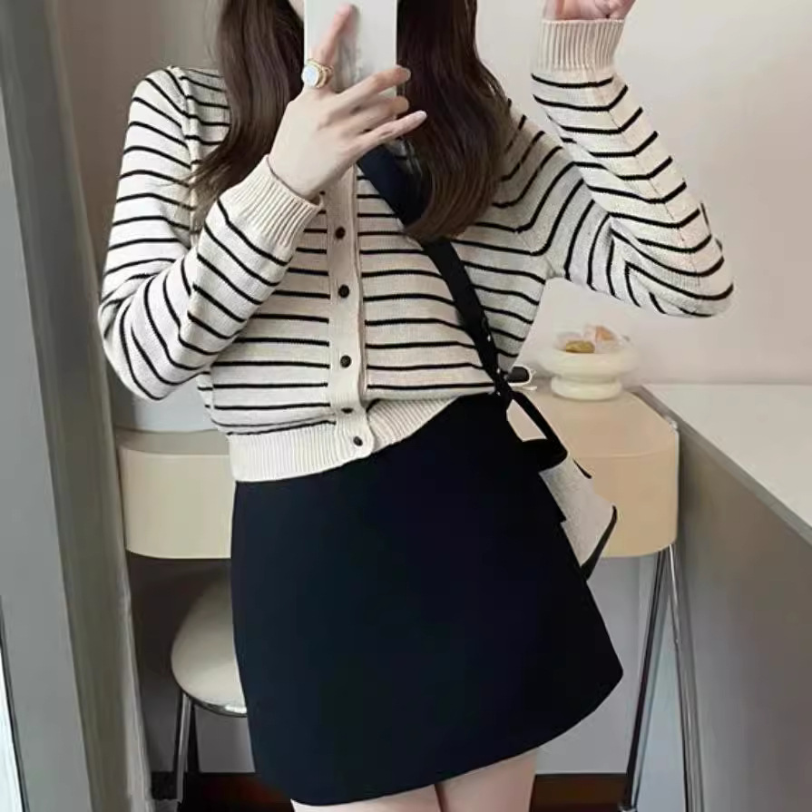살구색 줄무늬 폴로 목 니트 카디건 여성의 이른 가을 새로운 슬림 핏 슬리밍 내베이스 셔츠 탑 긴 소매스토어 가기