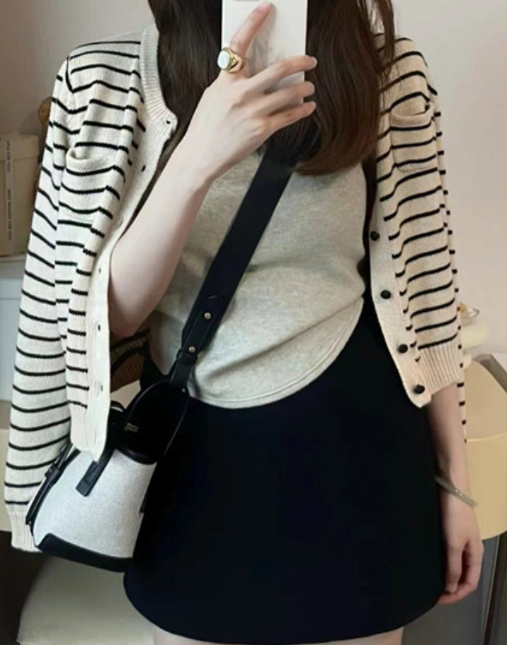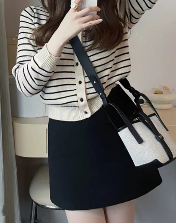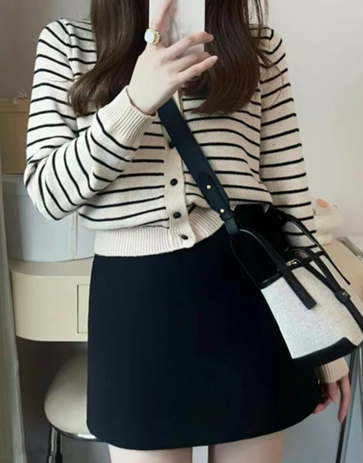 살구색 줄무늬 폴로 목 니트 카디건 여성의 이른 가을 새로운 슬림 핏 슬리밍 내베이스 셔츠 탑 긴 소매