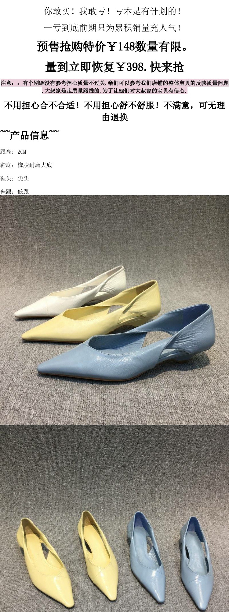 【3】关于售后:售出鞋子如有任何问题均需第一时间联系我们客服说明情况,我们会负责到底,退回运费按照寄出运费补回。本厂支持7天换货,只要不影响二次销售可以换同款,所有鞋子不支持退,拍错码子和颜色来回运费由买家自己承担!