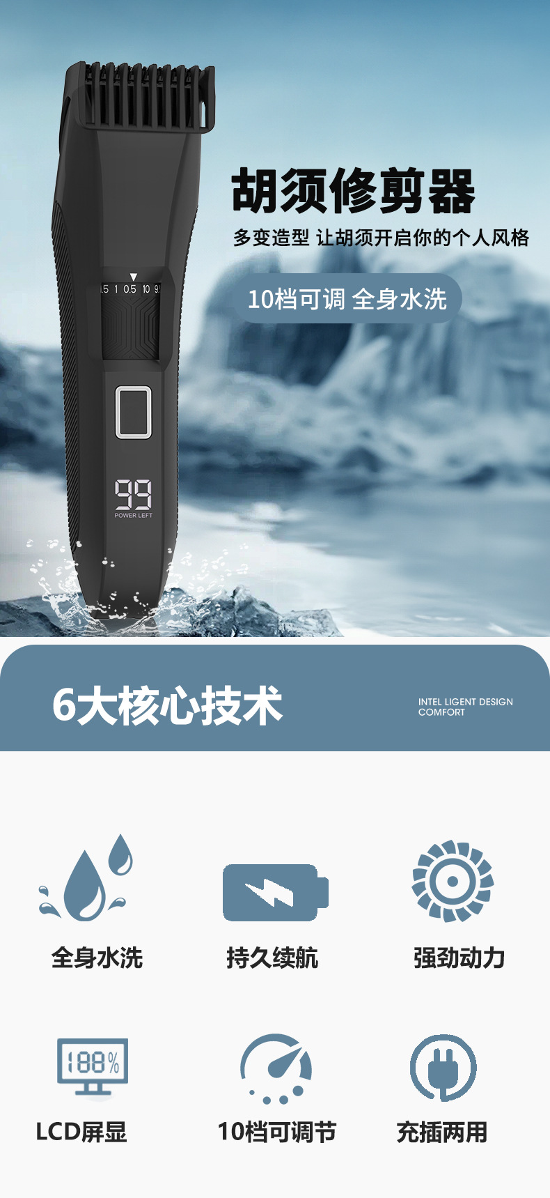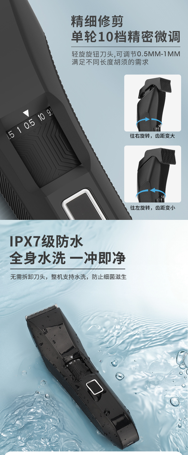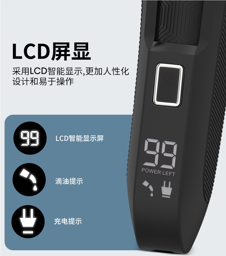 产品特点:液晶电量显示 全身防水 限位梳尺寸可调