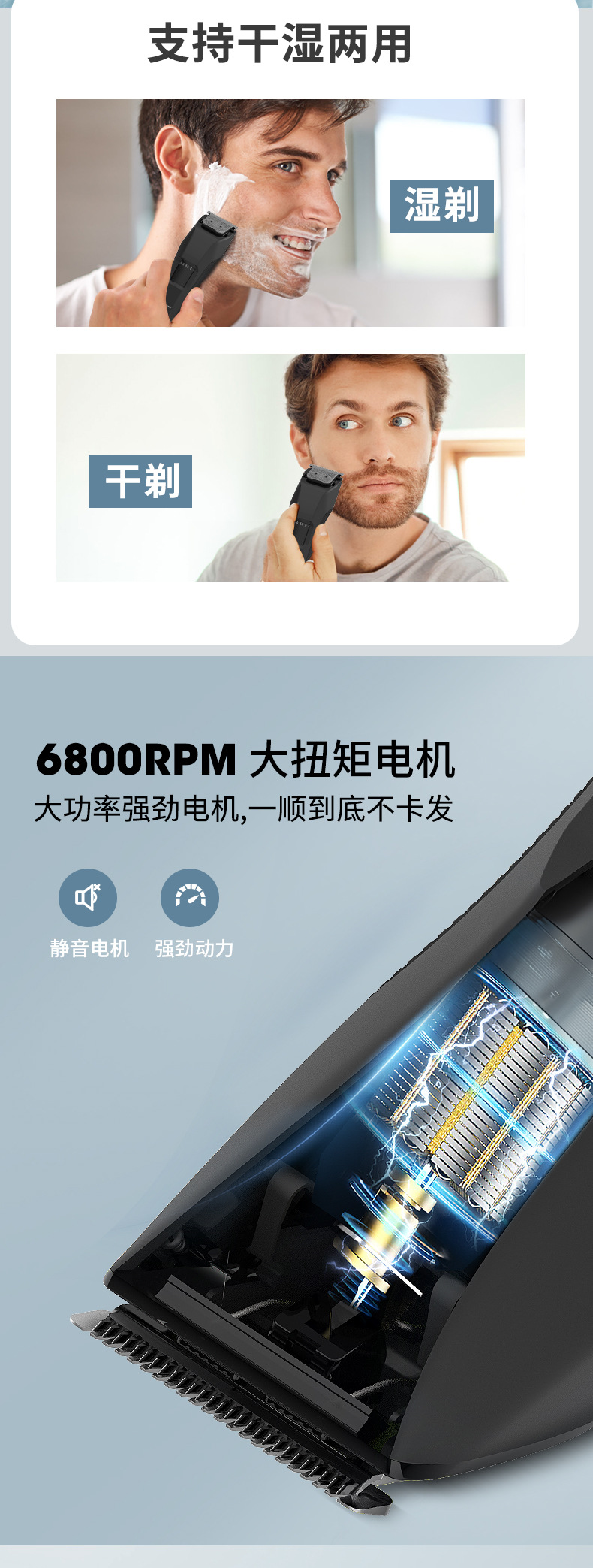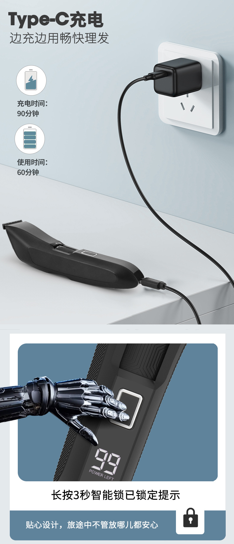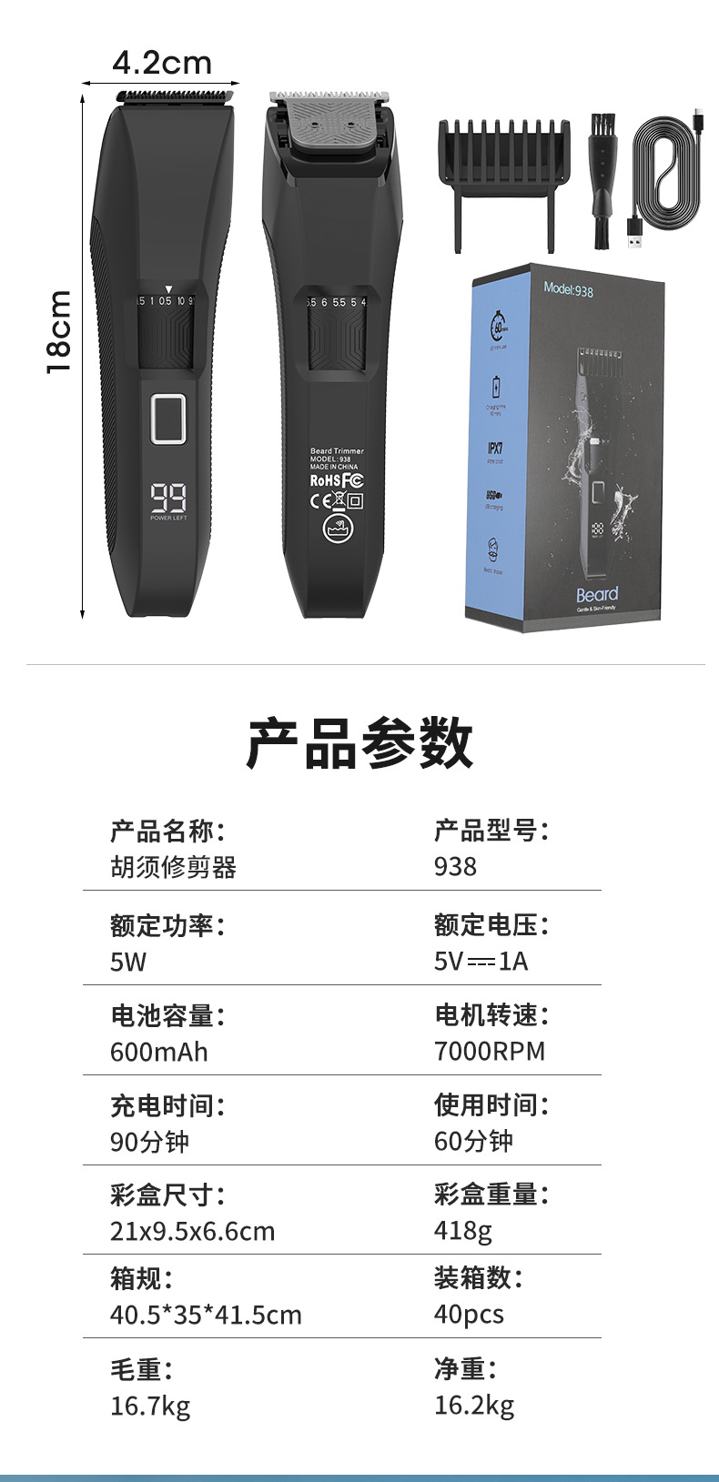 产品特点:液晶电量显示 全身防水 限位梳尺寸可调