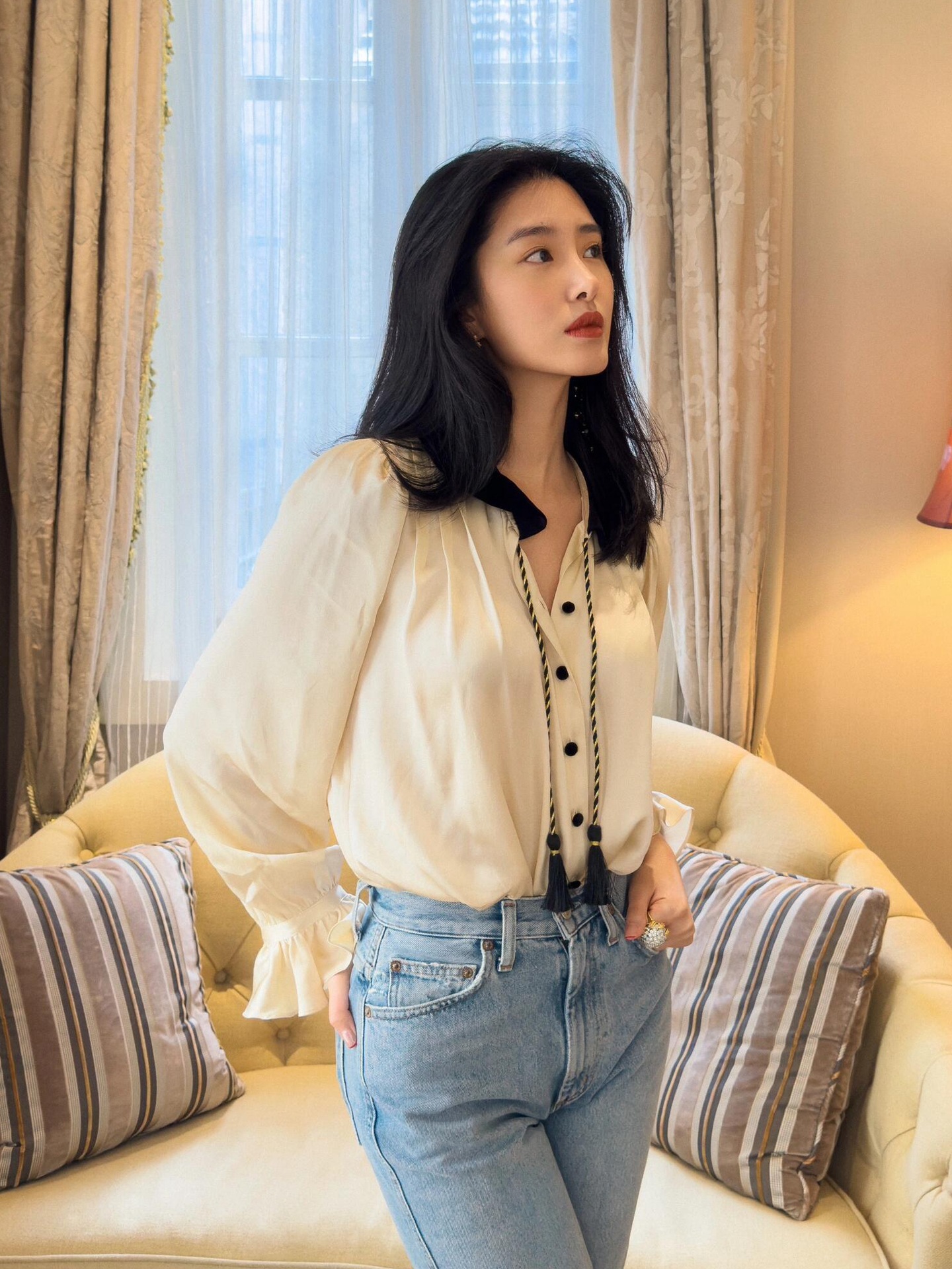 프렌치 스타일 퍼프 슬리브 셔츠 여성 복고풍 궁전 스타일 인형 칼라 밀 귀 레이스 업 탑 25 이른 봄