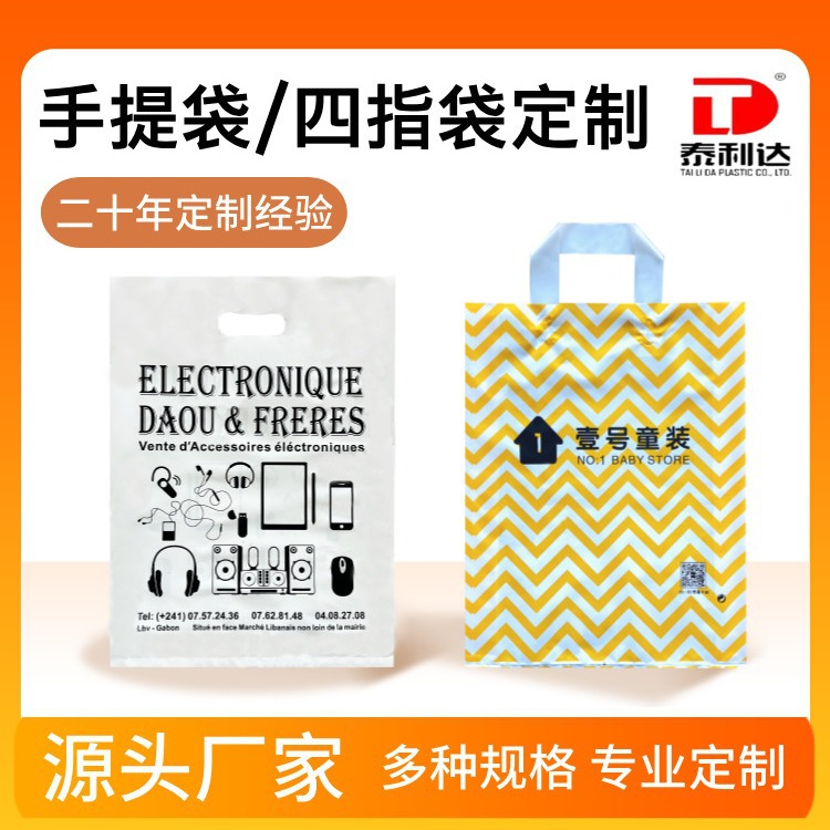 선물 가방 플라스틱 네 손가락 가방 펀치 플랫 입 손가락 가방 벌크 인쇄 로고 두꺼운 의류 휴대용 쇼핑백