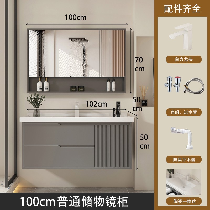 • 100cm 라이트 럭셔리 그레이 직각 벽 캐비닛 + 일반 반 거울 캐비닛 [무료 액세서리 풀 세트 + 설치]