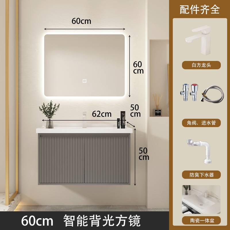 • 60cm 라이트 럭셔리 그레이 직각 벽 캐비닛 + 백라이트 사각 거울 [무료 액세서리 풀 세트 + 설치]