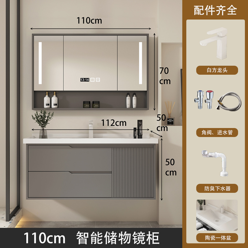 • 110cm 라이트 럭셔리 그레이 직각 벽 캐비닛 + 스마트 유리 거울 캐비닛 [무료 액세서리 풀 세트 + 설치]