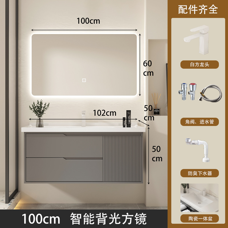 • 100cm 라이트 럭셔리 그레이 직각 벽 캐비닛 + 백라이트 사각 거울 [무료 액세서리 풀 세트 + 설치]