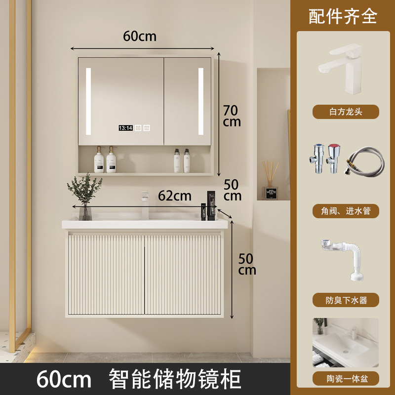 • 60cm 밀크티 컬러 직각 벽 캐비닛 + 스마트 유리 도어 거울 캐비닛 [무료 액세서리 풀 세트 + 설치]