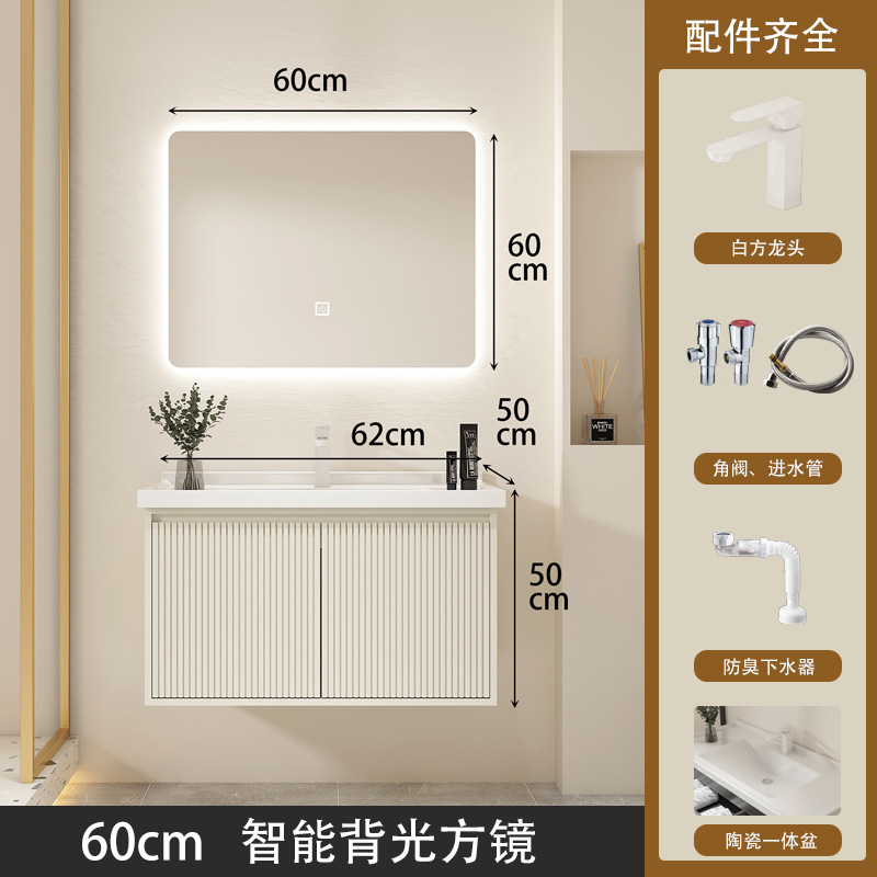 • 60cm 밀크티 컬러 직각 벽 캐비닛 + 백라이트 사각 거울 [무료 액세서리 풀 세트 + 설치]