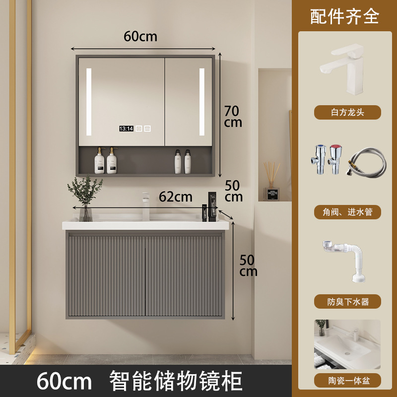 • 60cm 라이트 럭셔리 그레이 직각 벽 캐비닛 + 스마트 유리 거울 캐비닛 [무료 액세서리 풀 세트 + 설치]