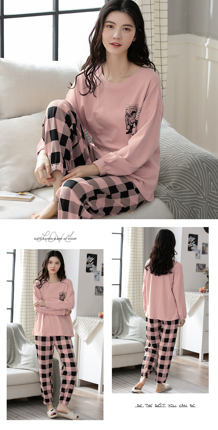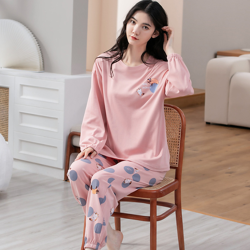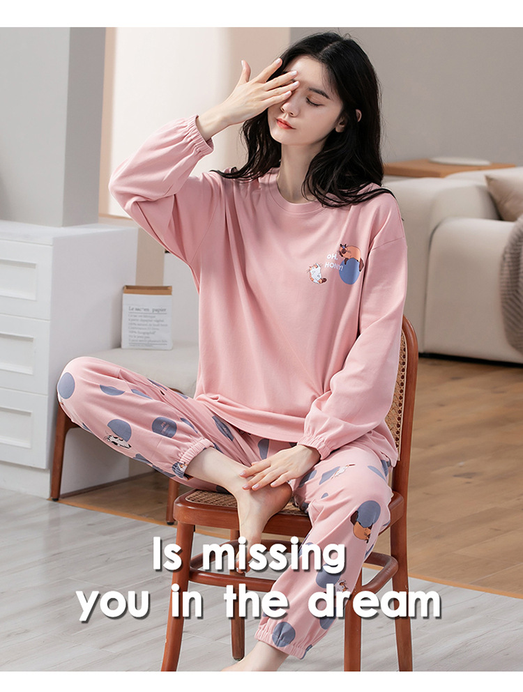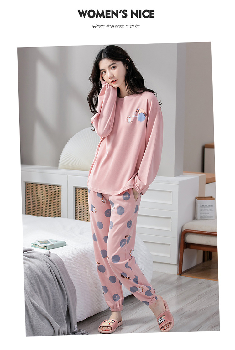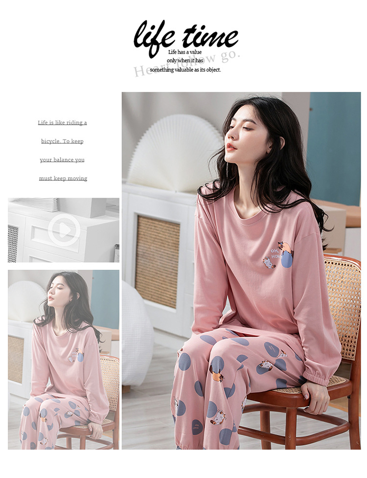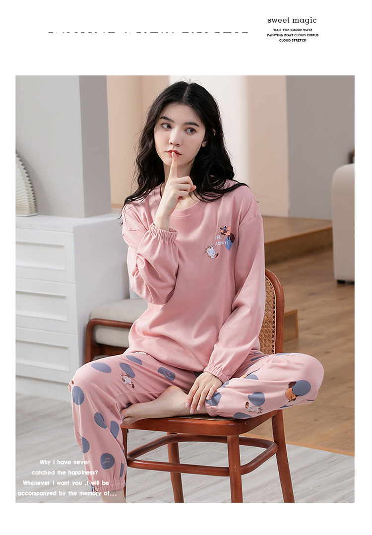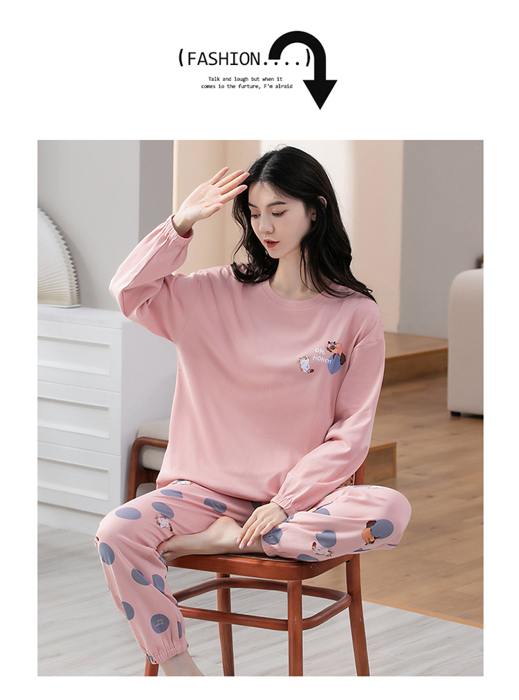 100% 면 잠옷 여성 봄과 가을 면화 긴 소매 라운드 넥 코튼 땀 흡수 통기성 복장 가을과 겨울 홈 의류 세트스토어 가기