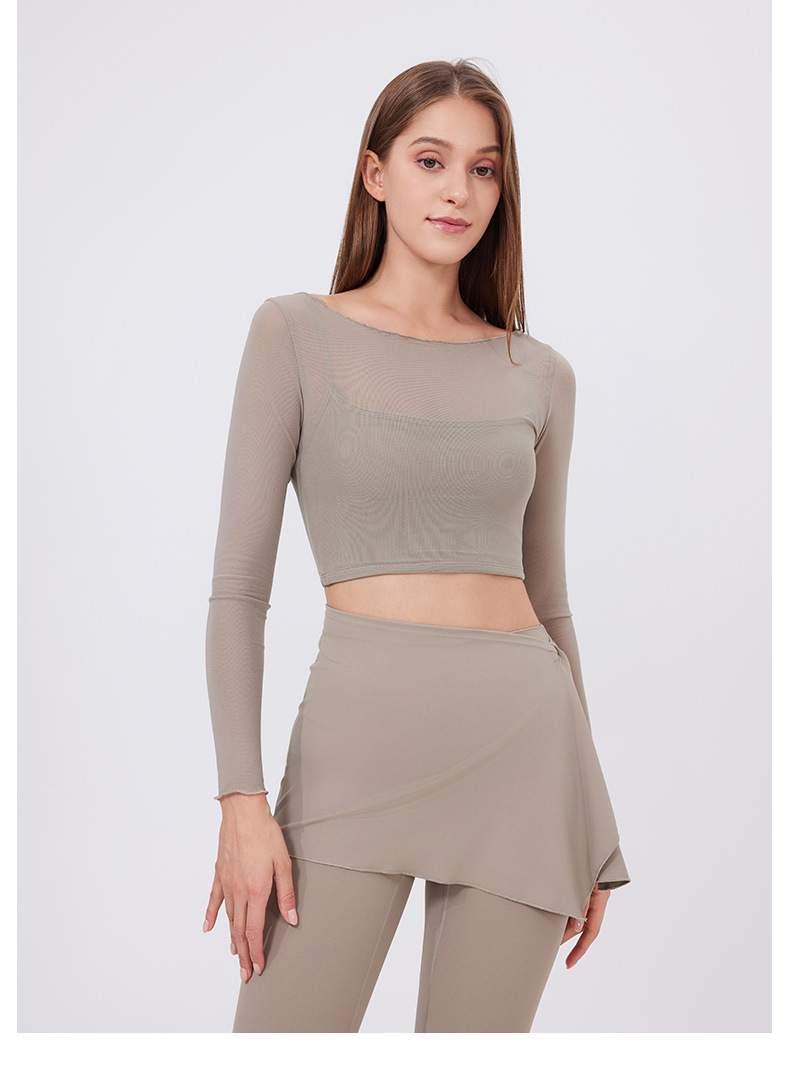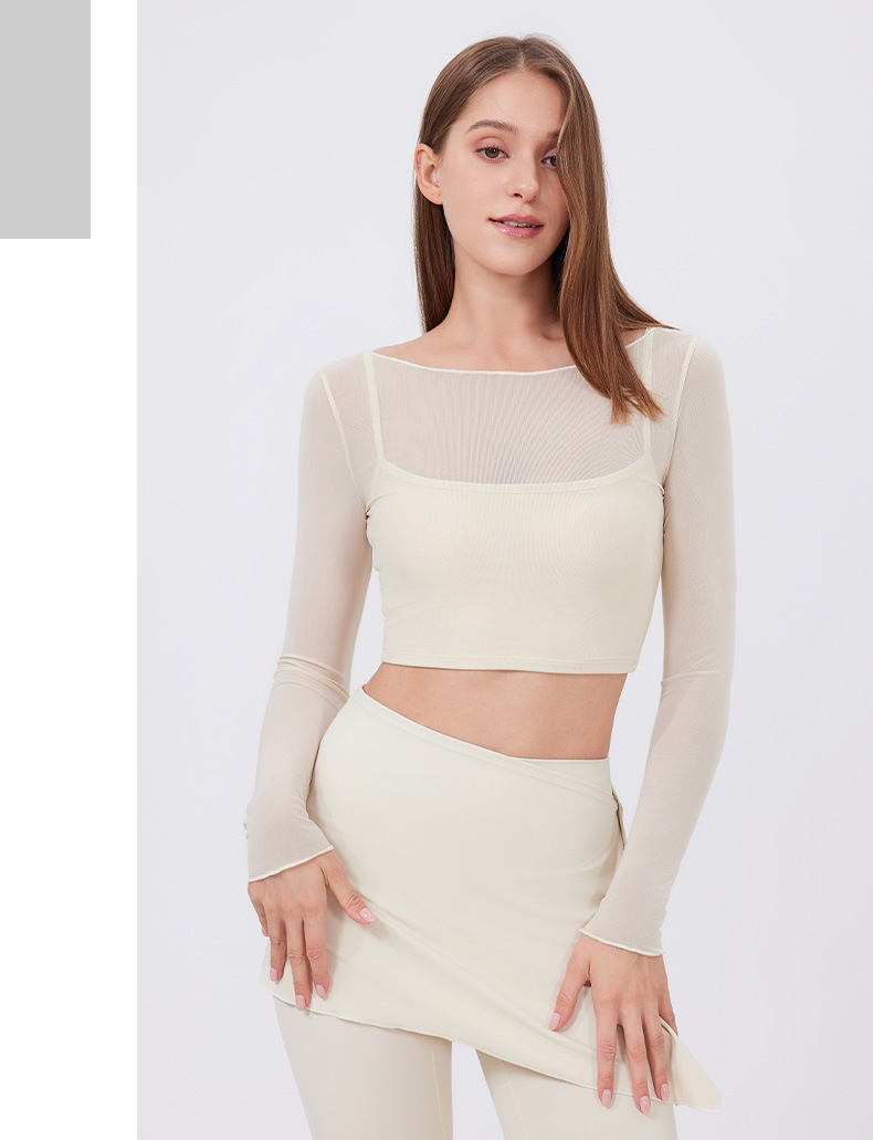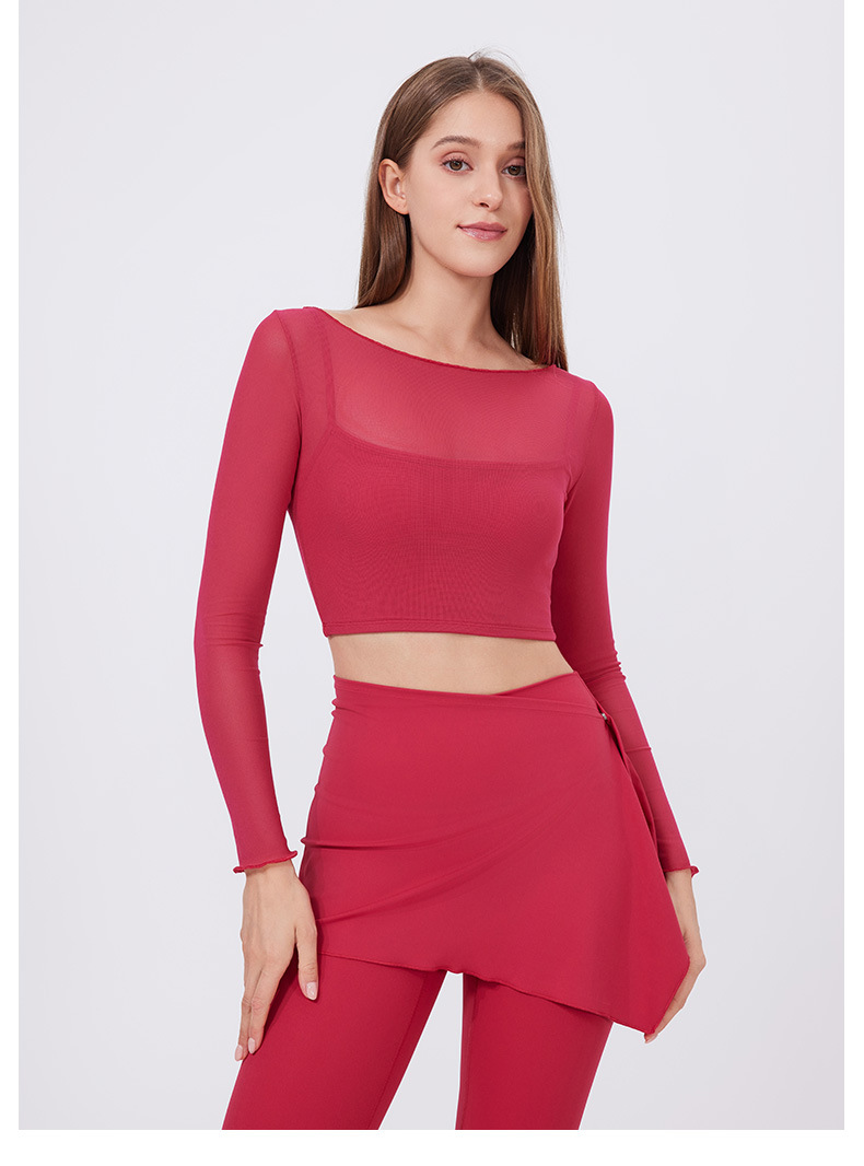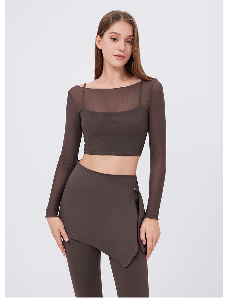 가짜 투피스 메쉬 스포츠 티셔츠 여성용 긴팔 요가 옷 가슴 매트 퀵 드라이 슬리밍 피트니스 옷