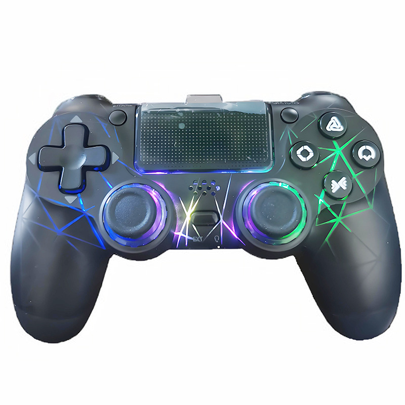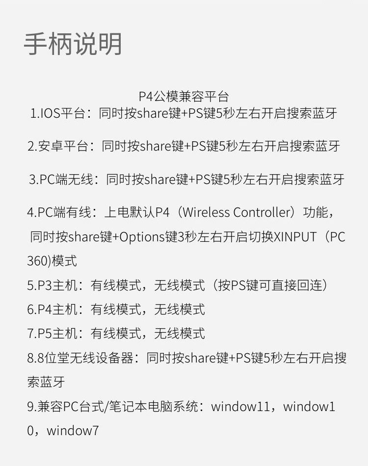 该款产品支持P4游戏主机,它为双震动无线蓝牙手柄,采用稳定5.0方案生产无延迟不断线。支持电池容量定制,3D摇杆定制,包装定制,logo定制。支持P4游戏主机,兼容P5游戏机部分功能,兼容P3游戏机,兼容电脑。