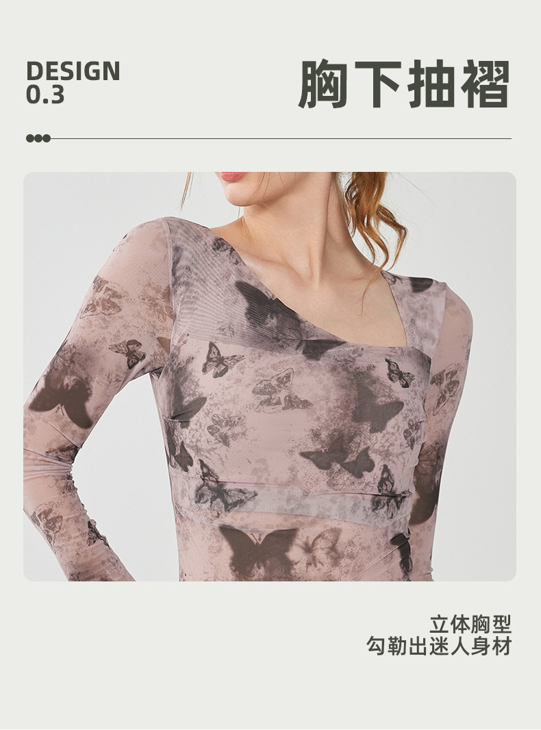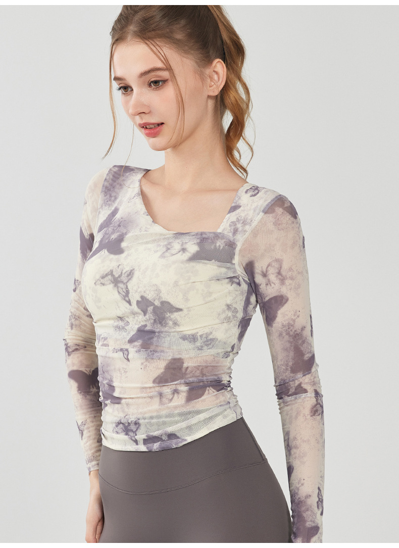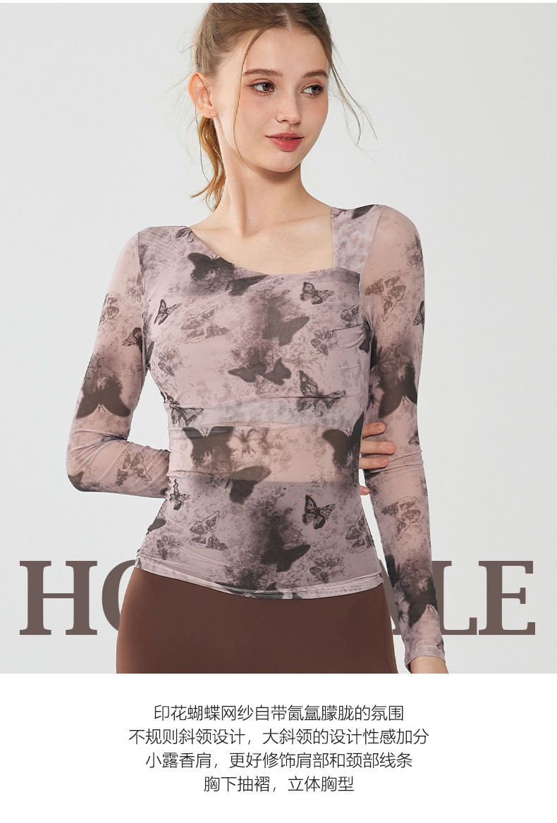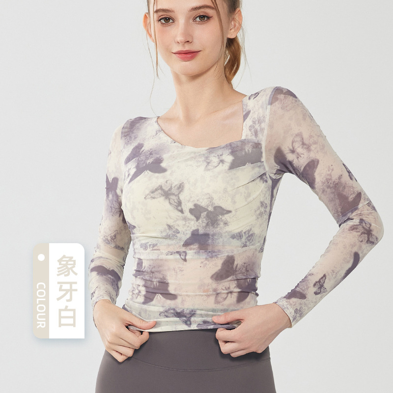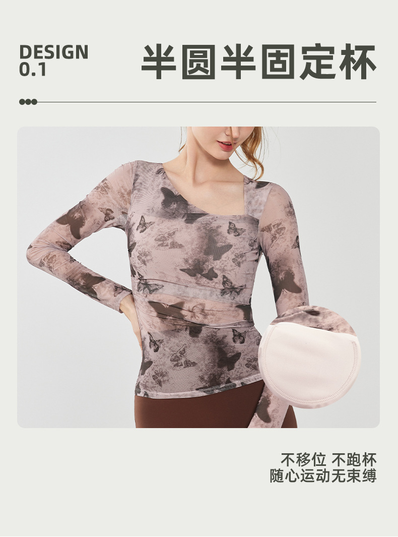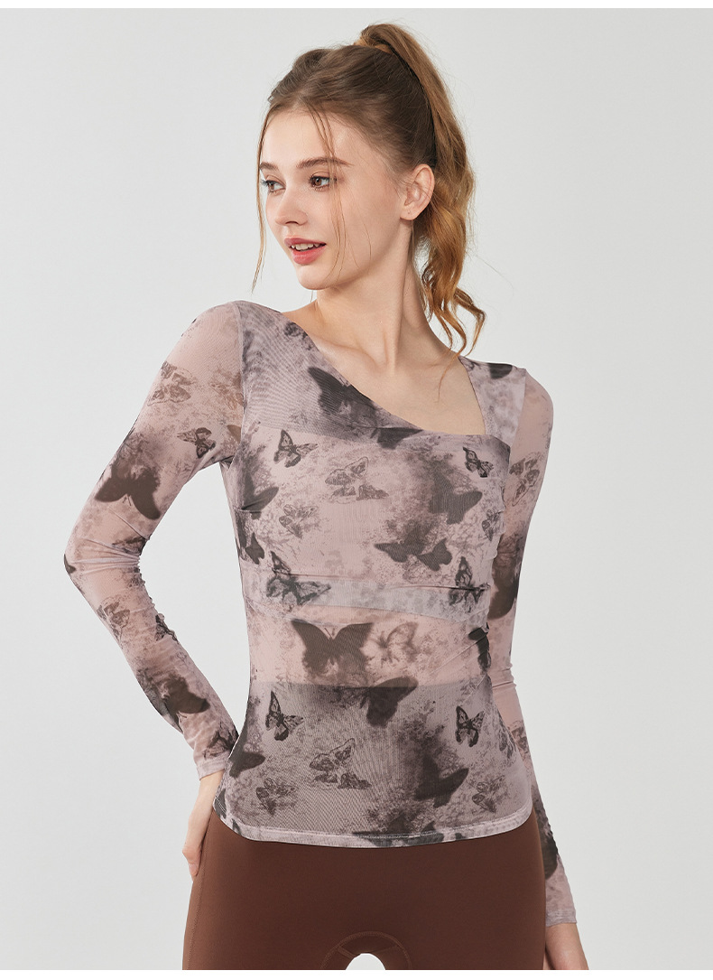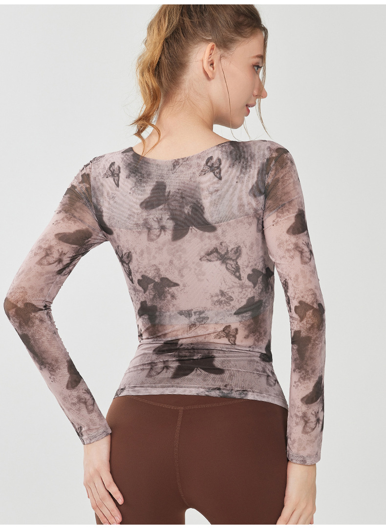 나비 인쇄 요가 세트 긴팔 원피스 가슴 매트 메쉬 통기성 빠른 건조 슬림 핏 스포츠 피트니스 세트 여성용 탑