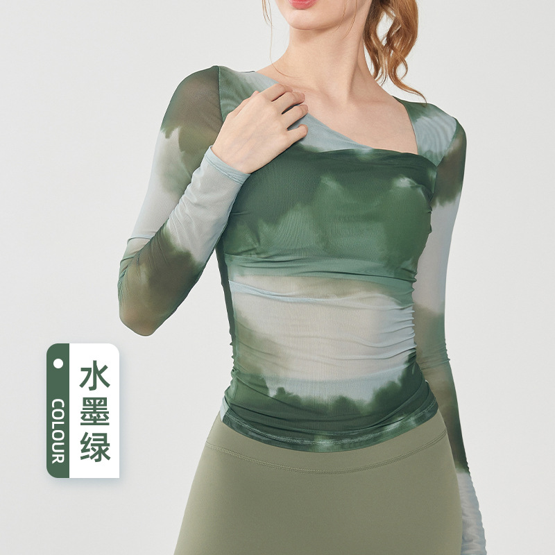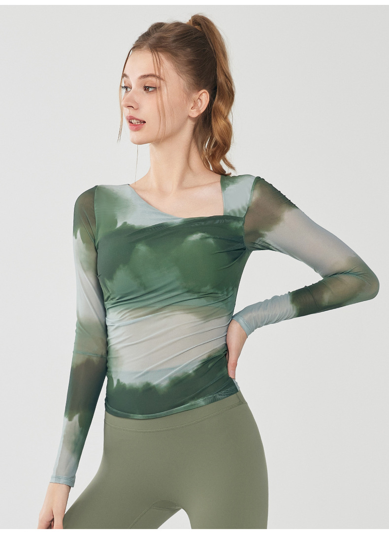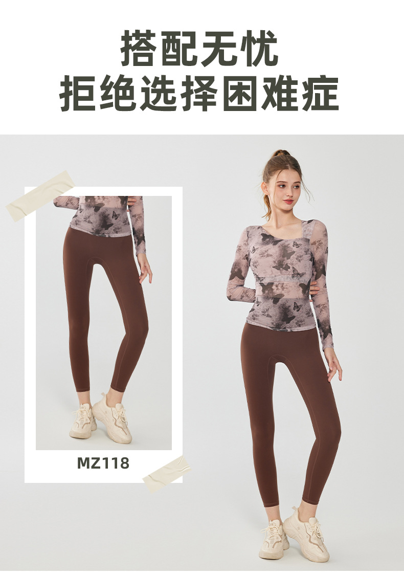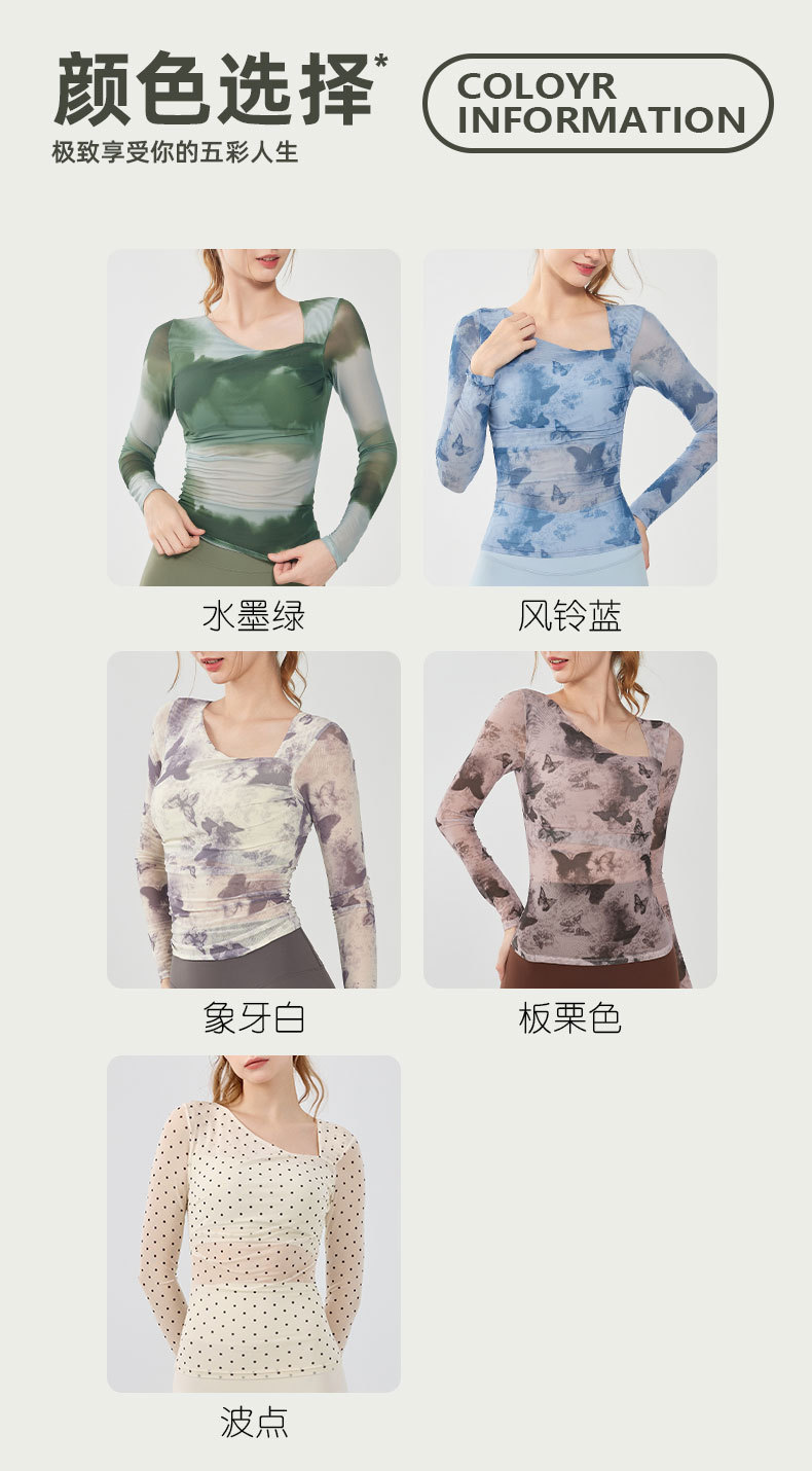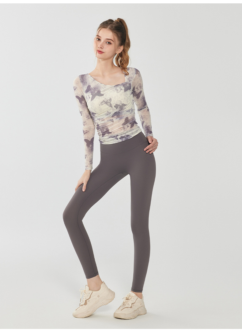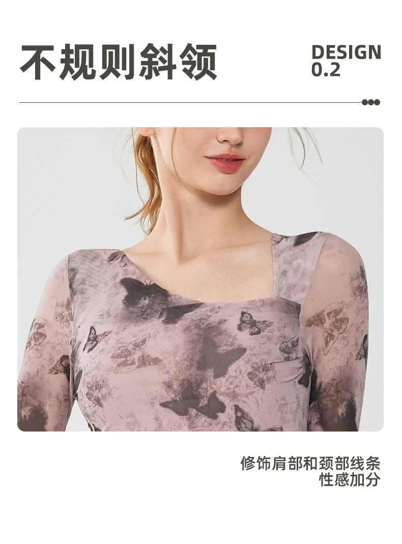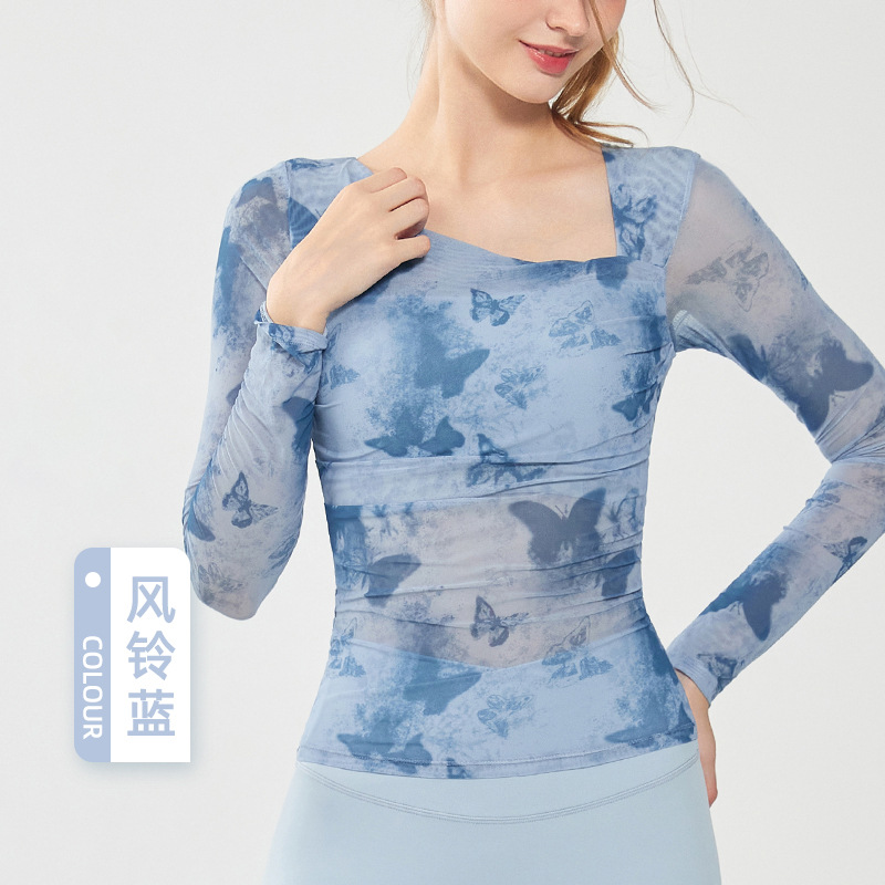 나비 인쇄 요가 세트 긴팔 원피스 가슴 매트 메쉬 통기성 빠른 건조 슬림 핏 스포츠 피트니스 세트 여성용 탑