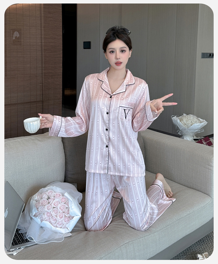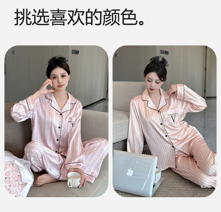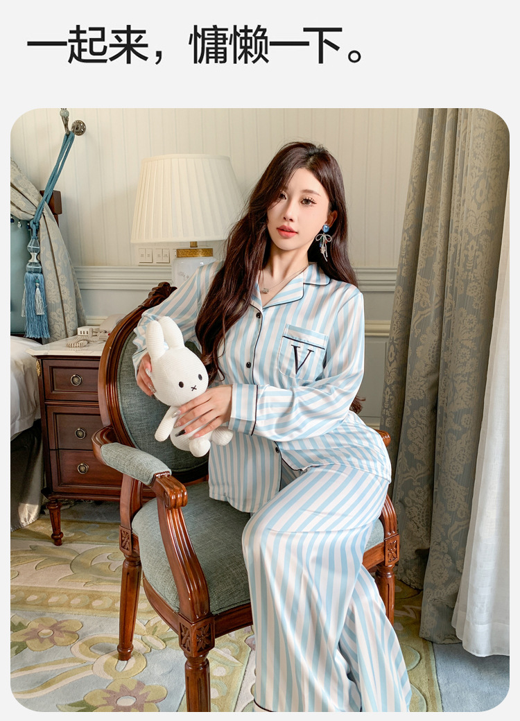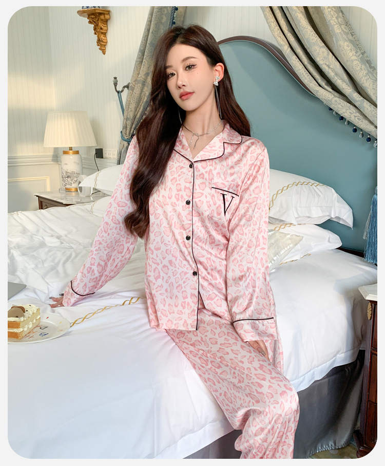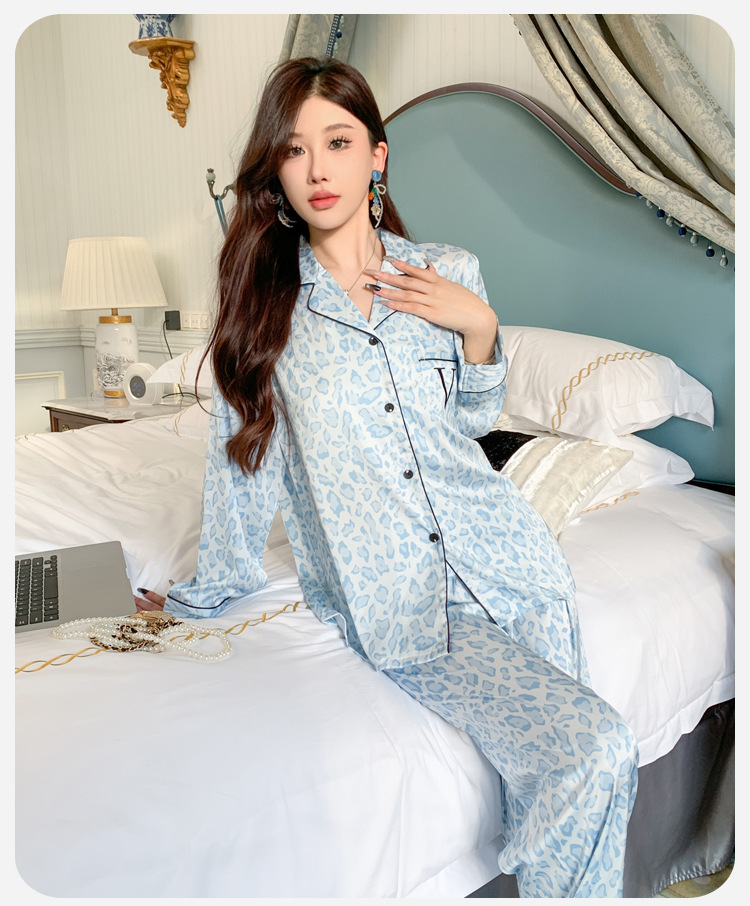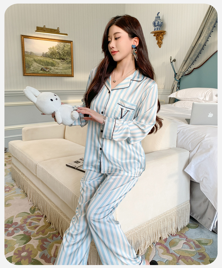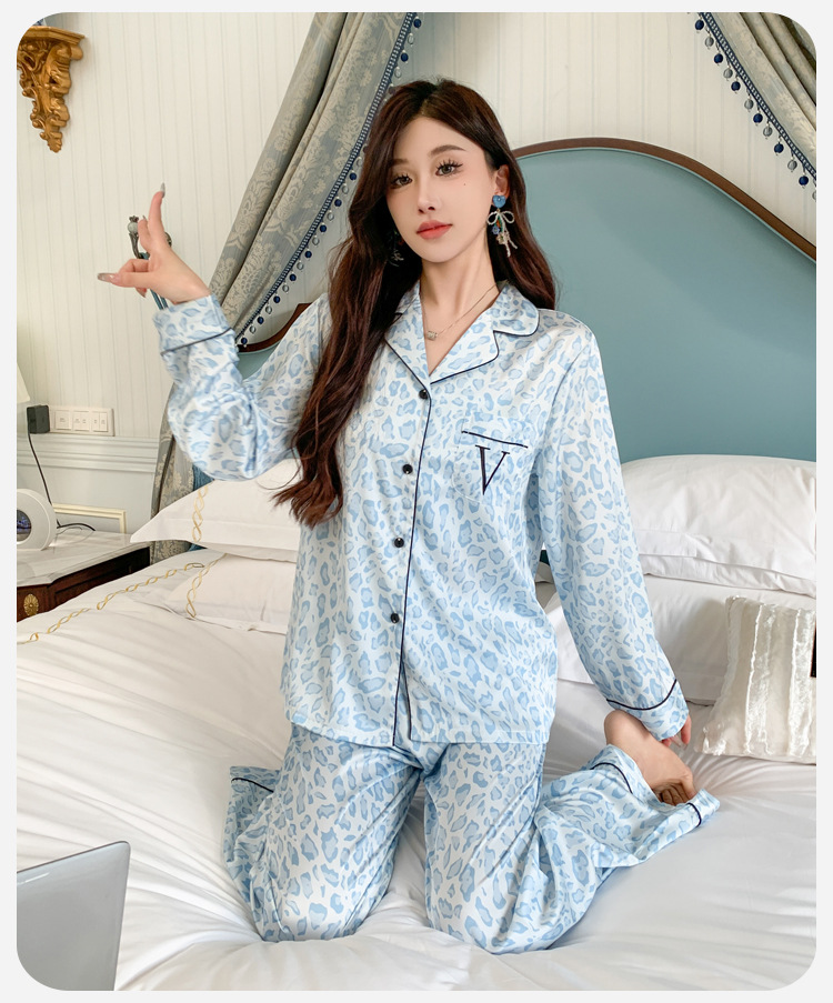 봄과 가을 새로운 여성의 얼음 실크 얇은 잠옷 긴팔 양복 물광택 실크 가정 의류 Пижама스토어 가기