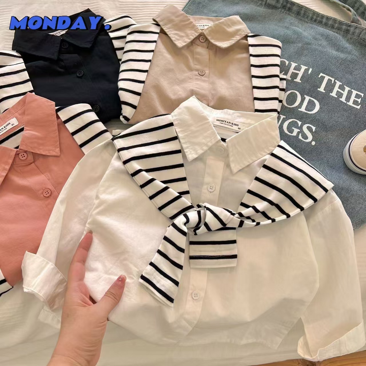 가을 2024 새로운 가짜 투피스 소년과 소녀 아기 솔리드 컬러 숄 셔츠 어린이 의류 어린이 셔츠 맞춤형 트렌디 코트스토어 가기