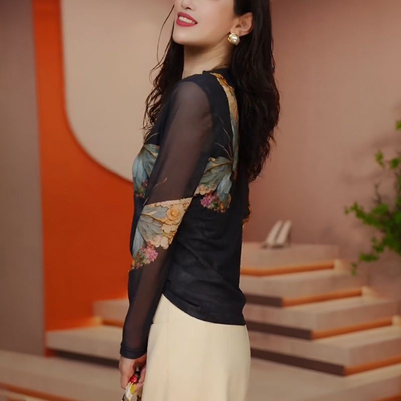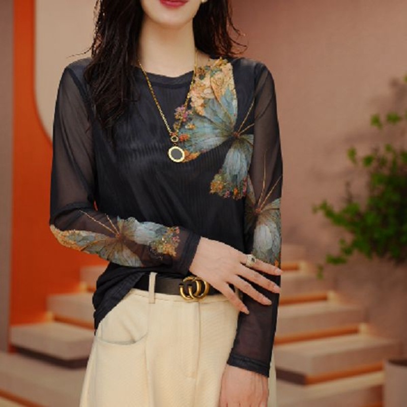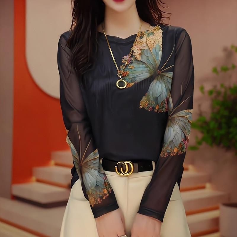 유럽산 메쉬베이스 셔츠 센스 여성용 긴팔 티셔츠 봄과 가을 둥근 목 스타일 프린트 스킨 더블 레이어 탑스토어 가기
