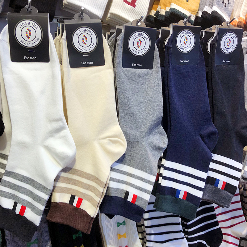 한국 수입 양말 트렌디 브랜드 빨간색과 파란색 남성 양말 2024 가을 새로운 미드 튜브 3 바 캐주얼 트렌디 코튼 양말스토어 가기