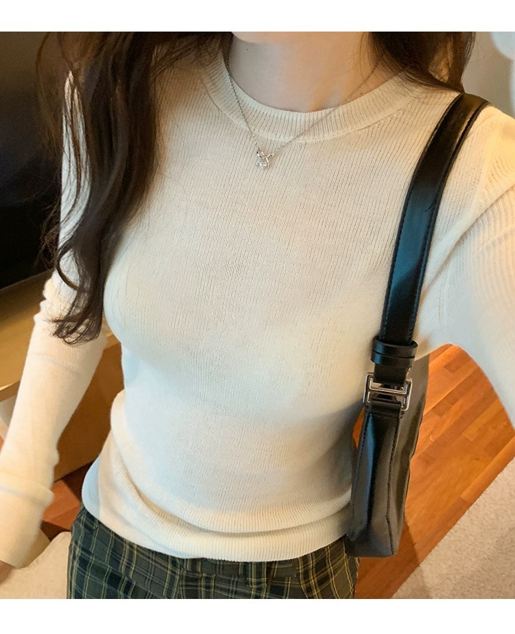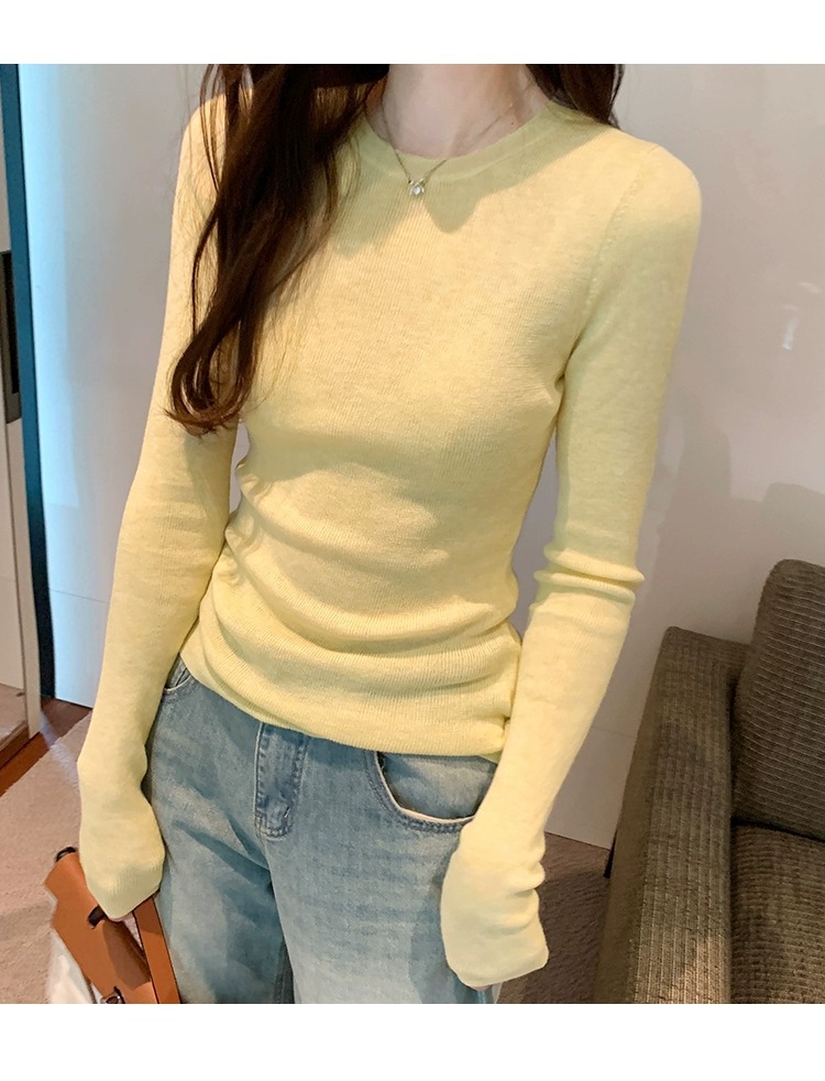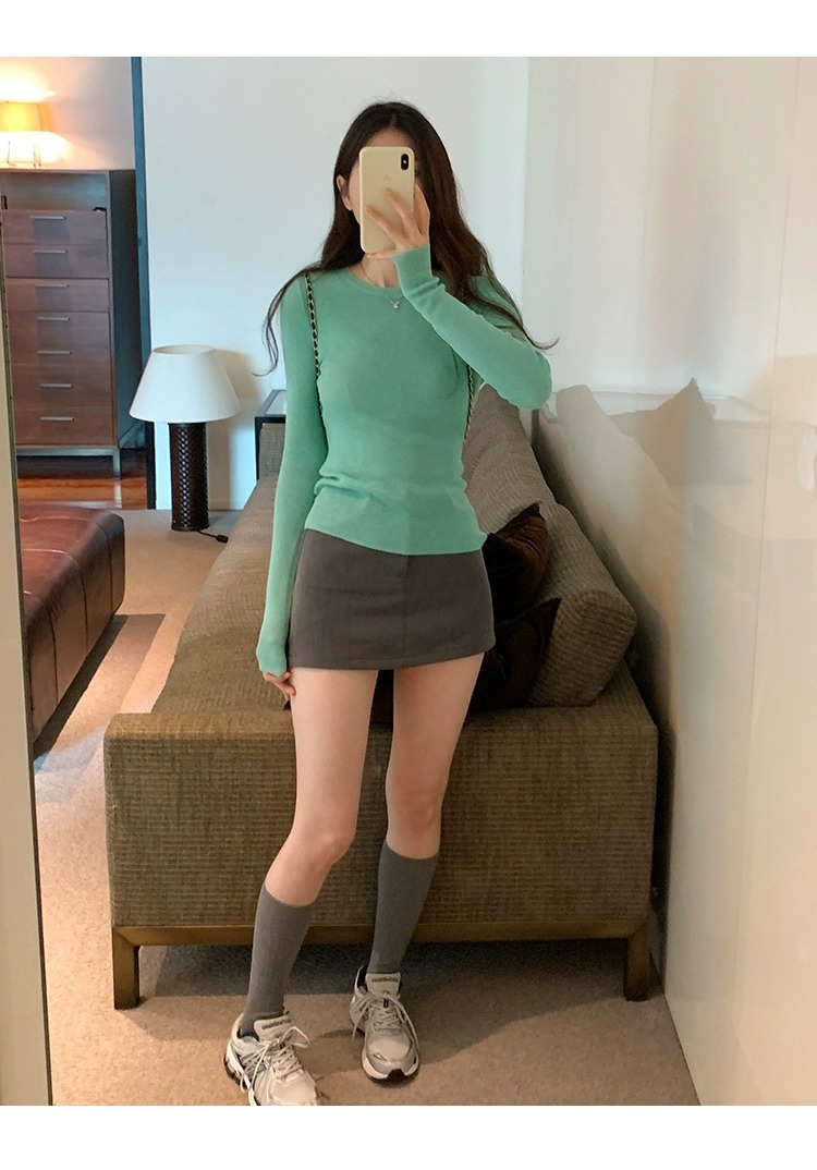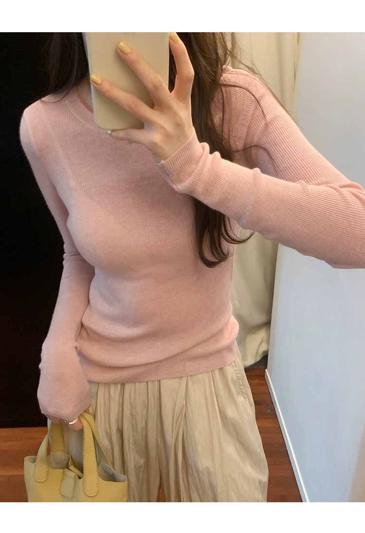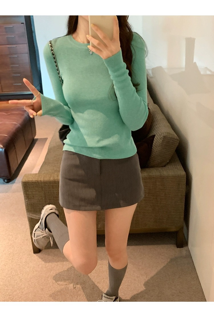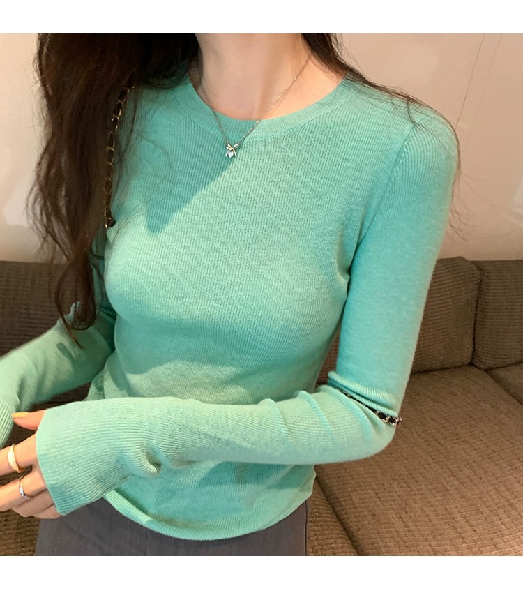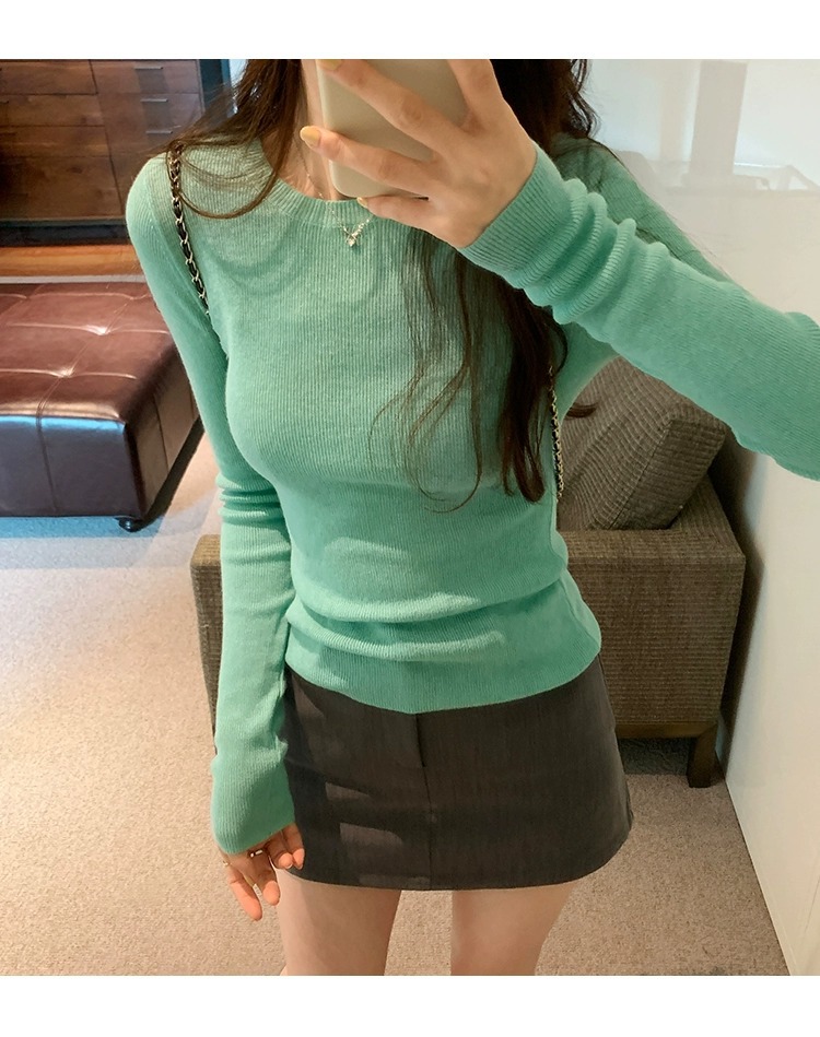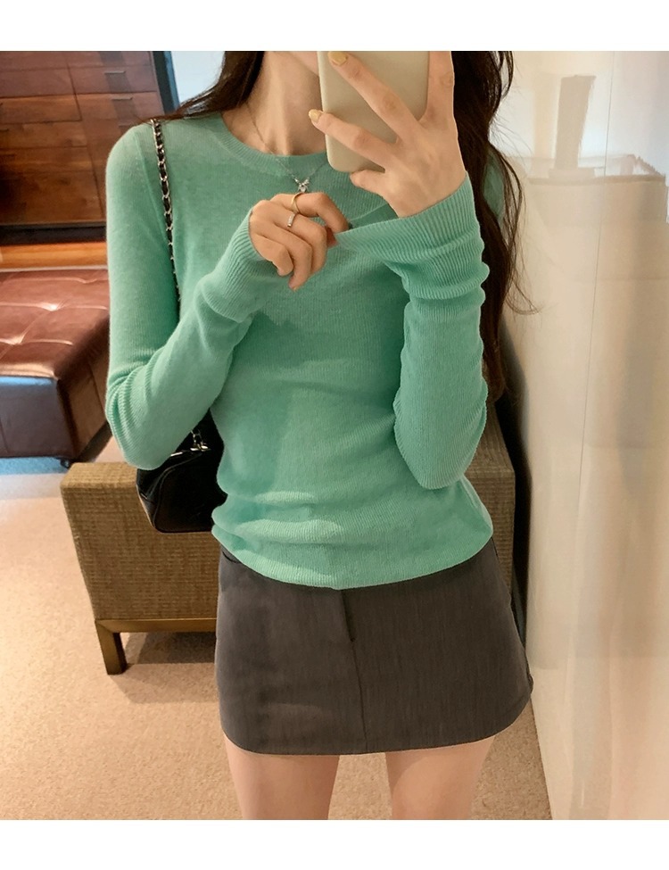 한국 스타일 민트 그린 니트 이너웨어 2025 초봄 신상 슬림핏 얇은 스타일 약간 비침있는 달콤하고 매혹적인 긴팔 여성 상의스토어 가기