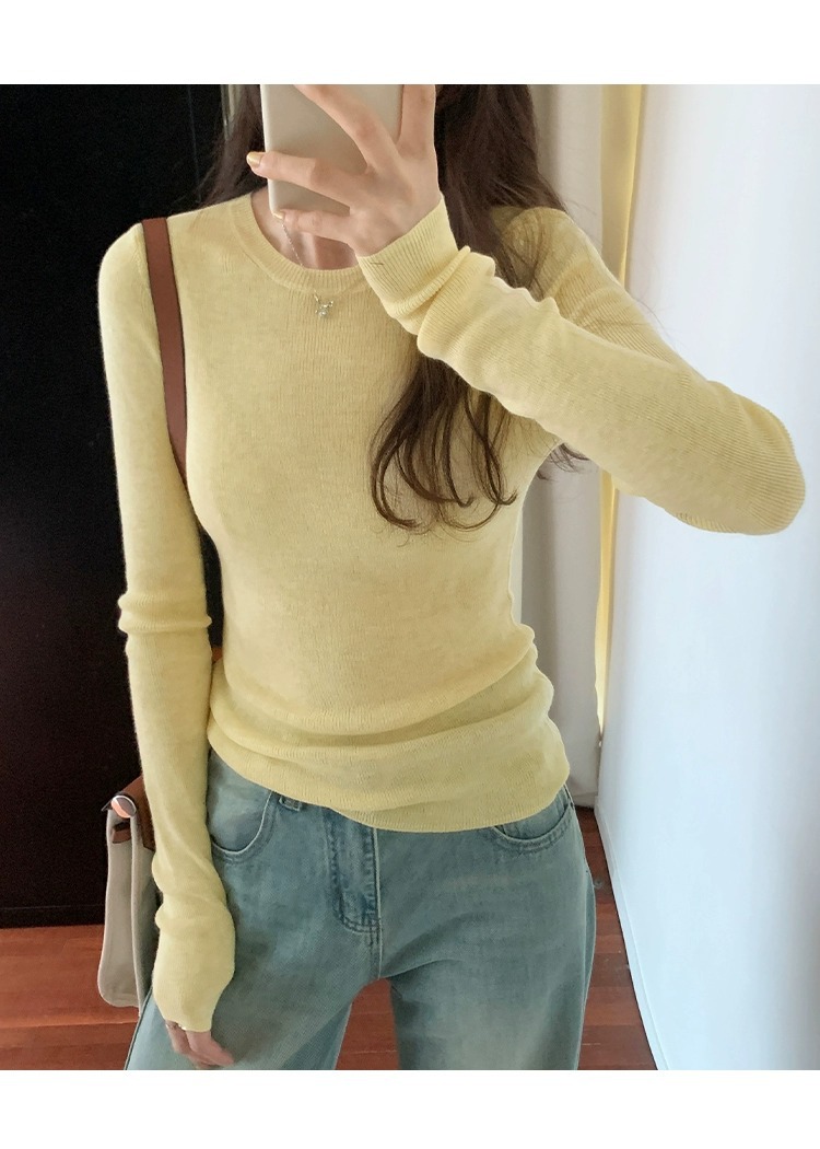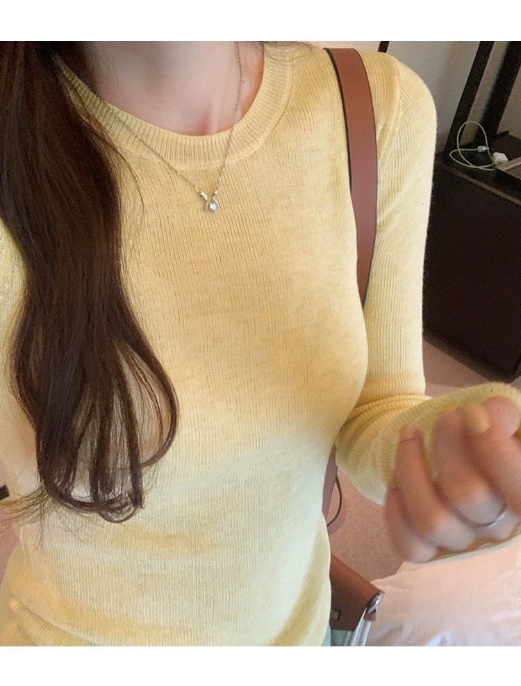 한국 스타일 민트 그린 니트 이너웨어 2025 초봄 신상 슬림핏 얇은 스타일 약간 비침있는 달콤하고 매혹적인 긴팔 여성 상의