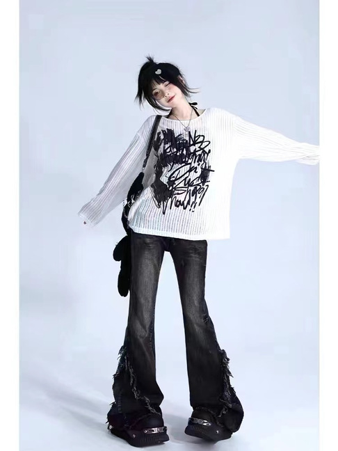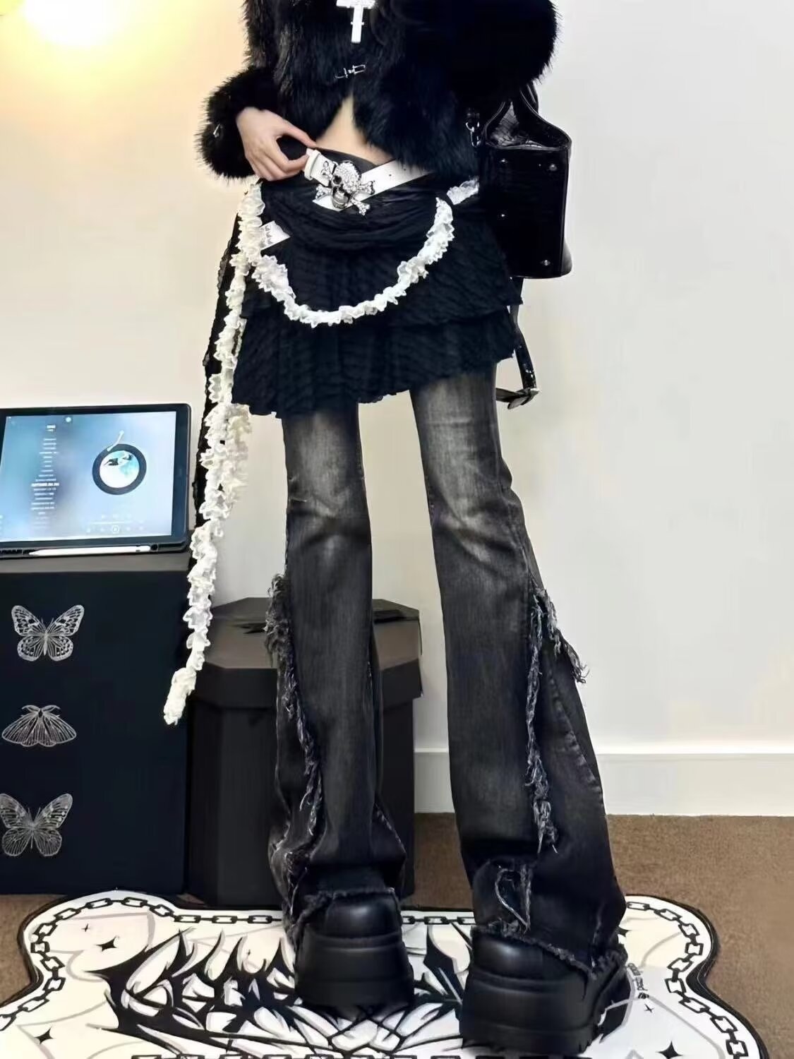 뜨거운 소녀 낮은 허리 그레이 올 매치 마이크로 라르 청바지 여성의 2024 가을 새로운 틈새 레트로 모피 엣지 탑 바지