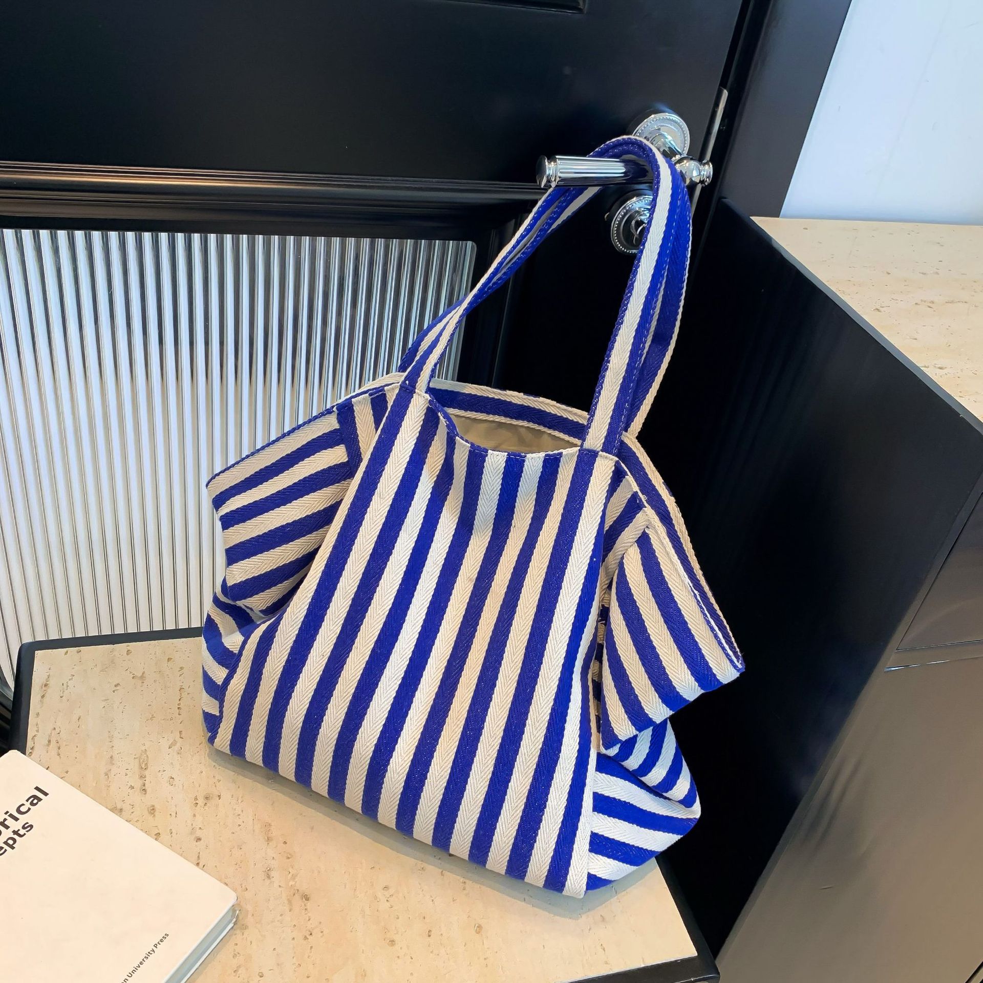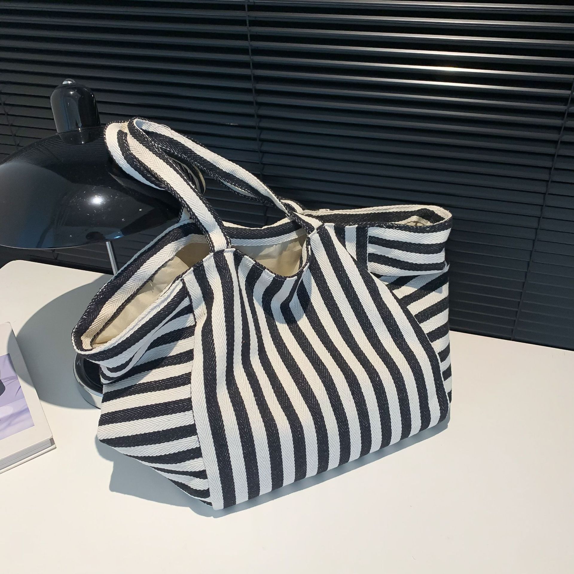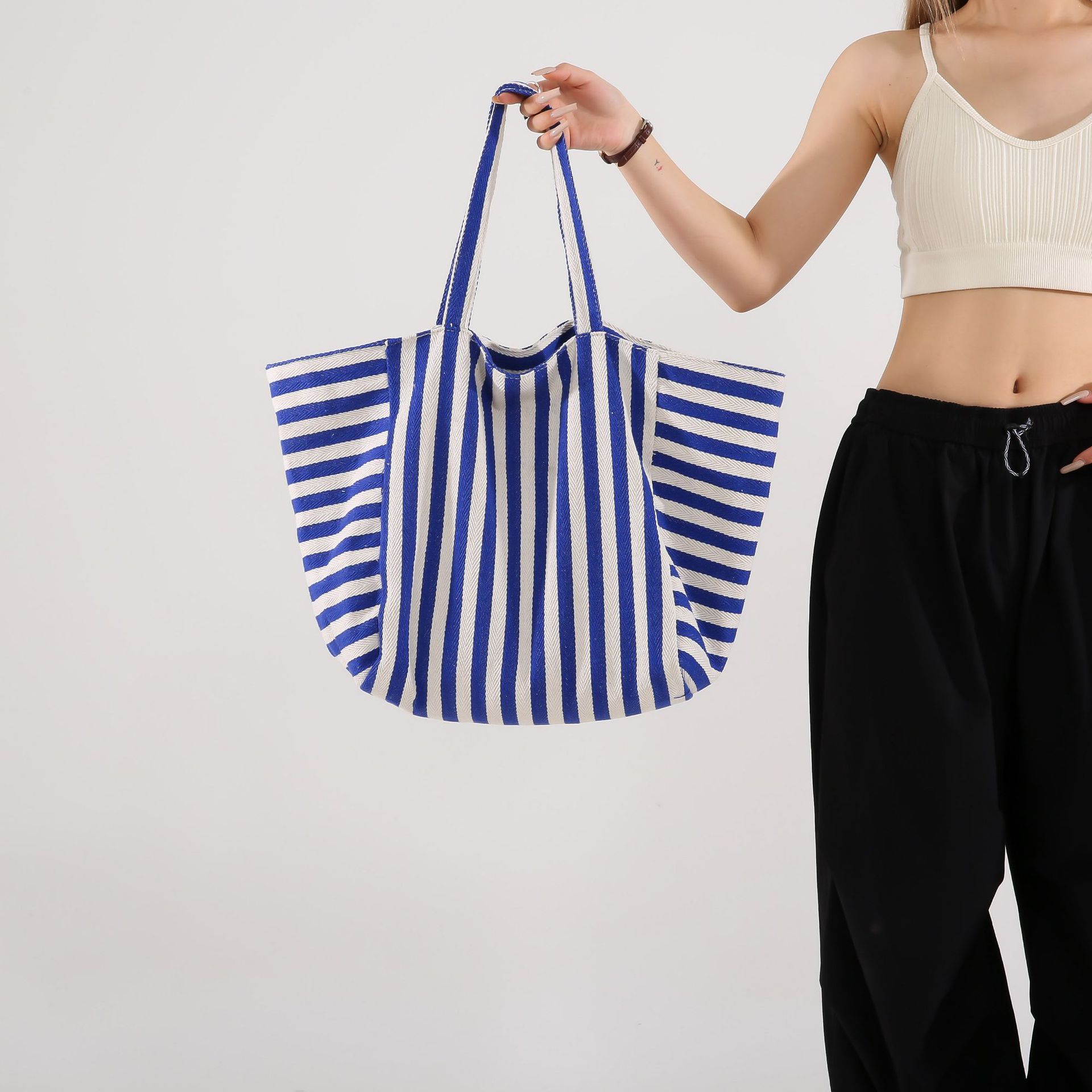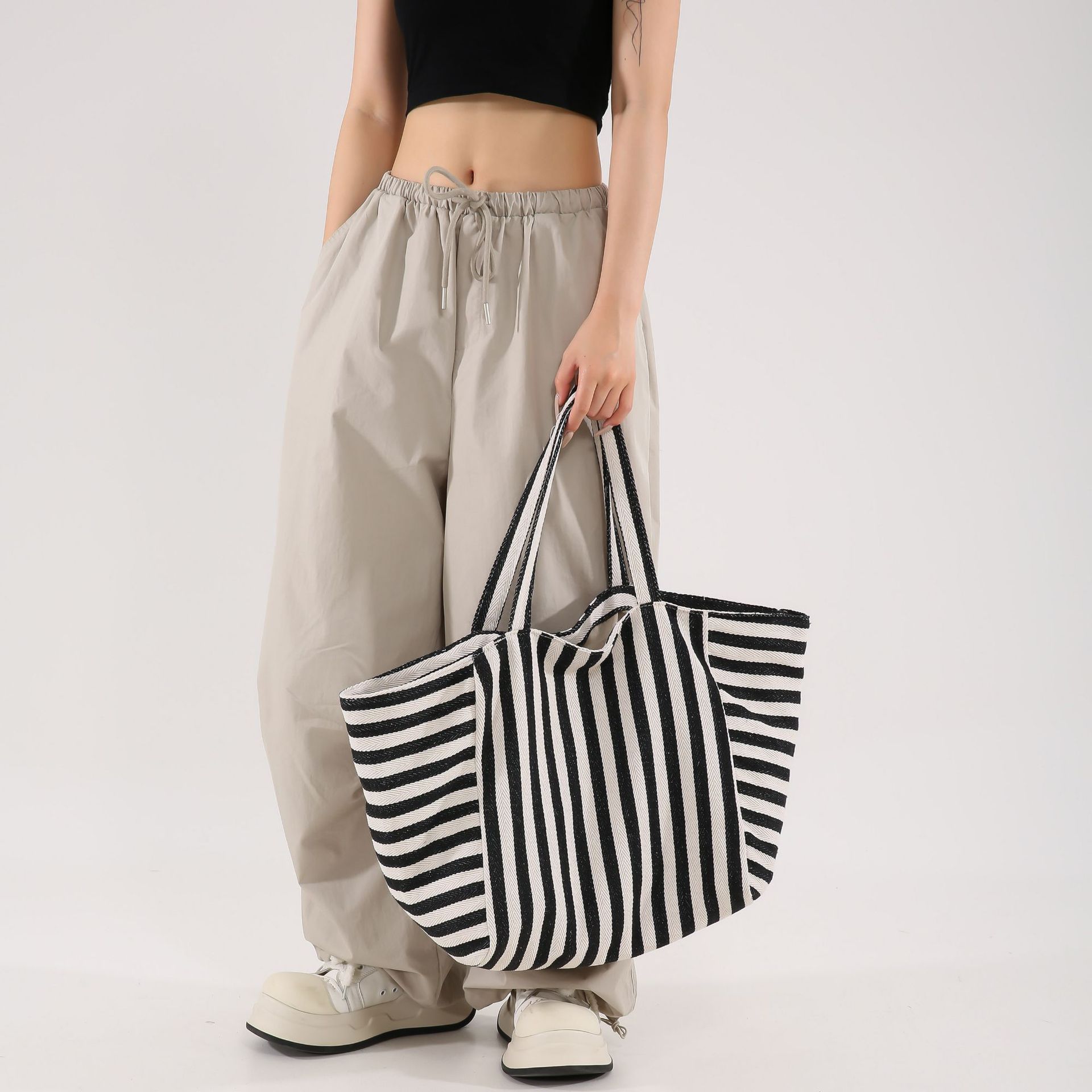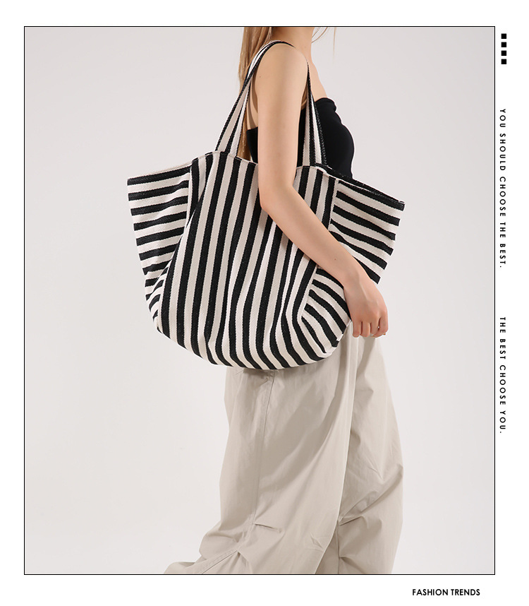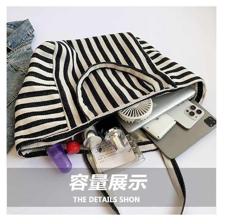 한국 유행 줄무늬 간단한 양면 캔버스 가방 2025 새로운 여름 대용량 학생 토트 백 쇼핑백스토어 가기