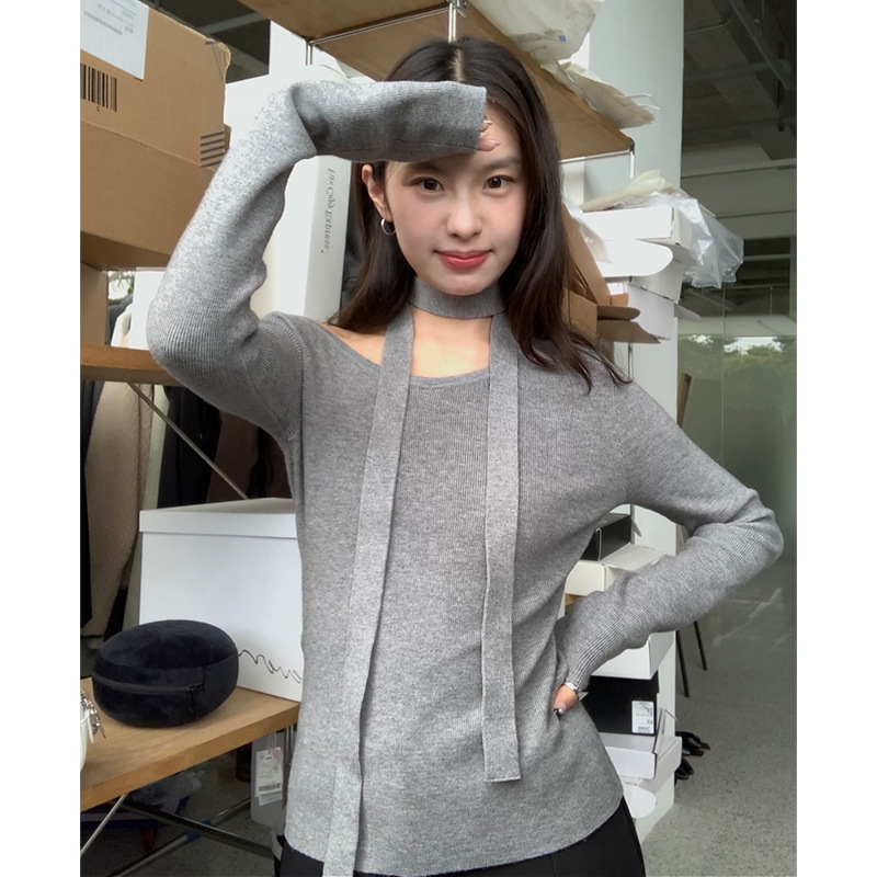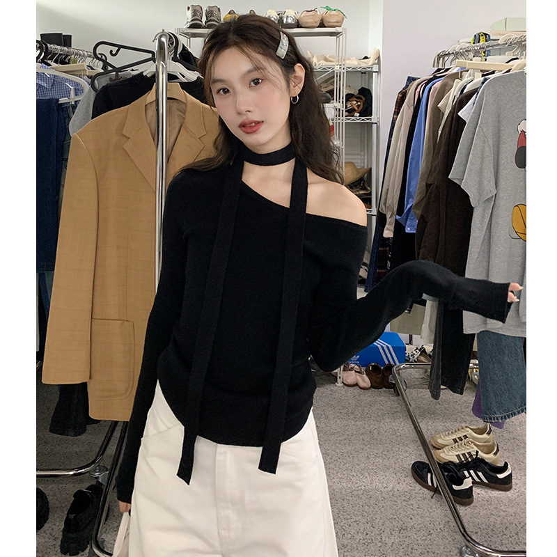 여성을 위한 핫걸 홀터넥 원숄더 니트 밑단 셔츠, 가을 신상 디자인, 슬림핏, 섹시한 오프숄더 탑스토어 가기