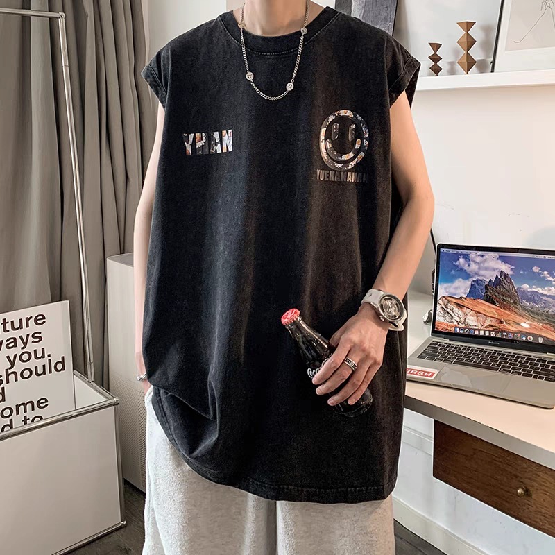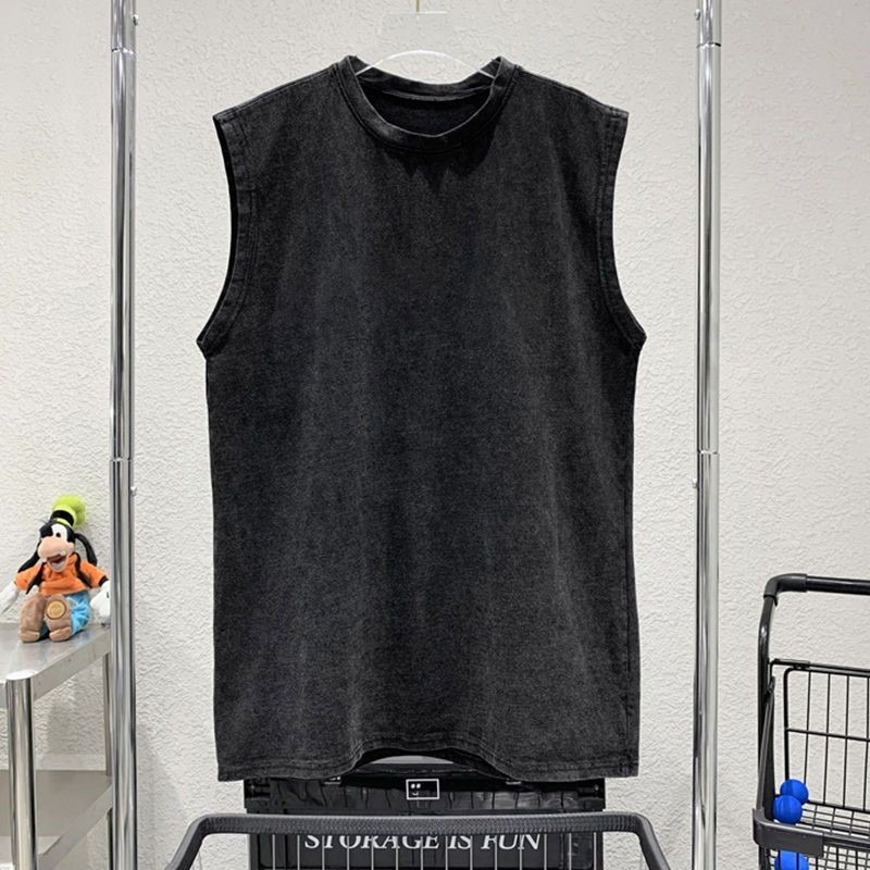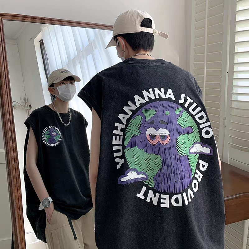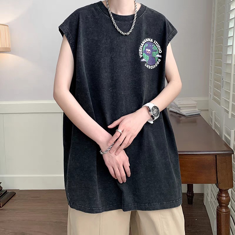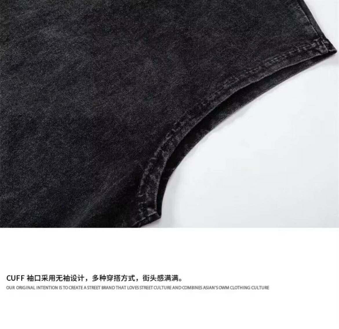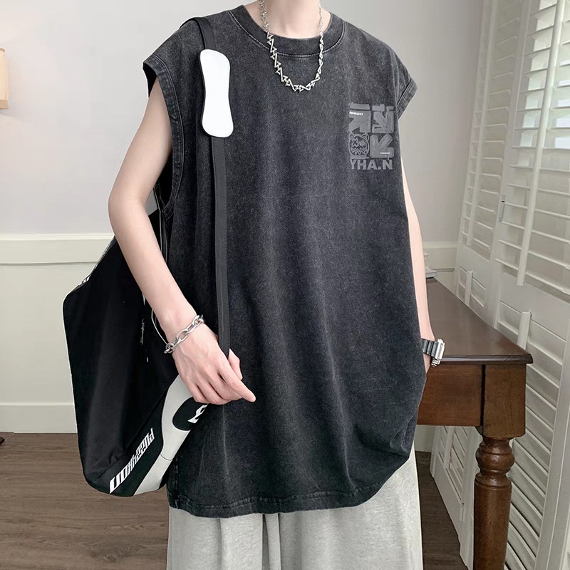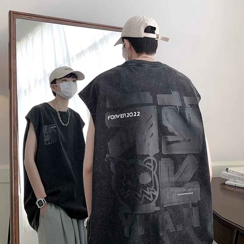 여름 인쇄 Ins 트렌디 하이 스트리트 캐주얼 웨이스트 코트 남성용 레트로 느슨한 청소년 세탁 민소매 블랙 티셔츠스토어 가기